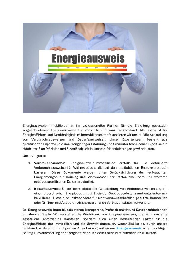 Energieausweis-Immobilie.de ist Ihr kompetenter Partner in Deutschland, wenn es um die Ausstellung von Energieausweisen und die Beratung zur Energieeffizienz Ihrer Immobilien geht. Wir sind spezialisiert auf Verbrauchs- und Bedarfsausweise und bieten einen umfassenden Service, der auf fundierter Expertise und einem tiefen Verständnis für Nachhaltigkeit im Immobiliensektor basiert.