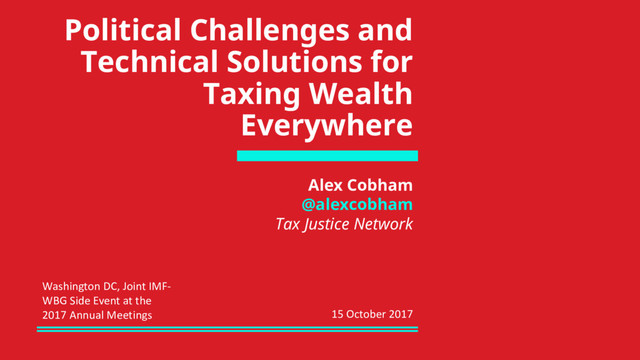 Alex Cobham, CEO of the Tax Justice Network, sets out some of the technical and political issues surrounding wealth taxation at the annual meetings of the World Bank Group.