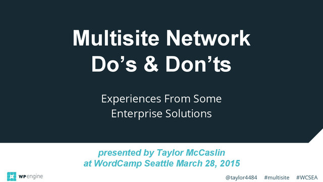 With great power, comes great responsibility. During this talk, Taylor will step through the do’s and don’ts of Multisite Networks. He will share how WordPress Multisite can be your best friend or worst enemy… but usually both… at the same time.