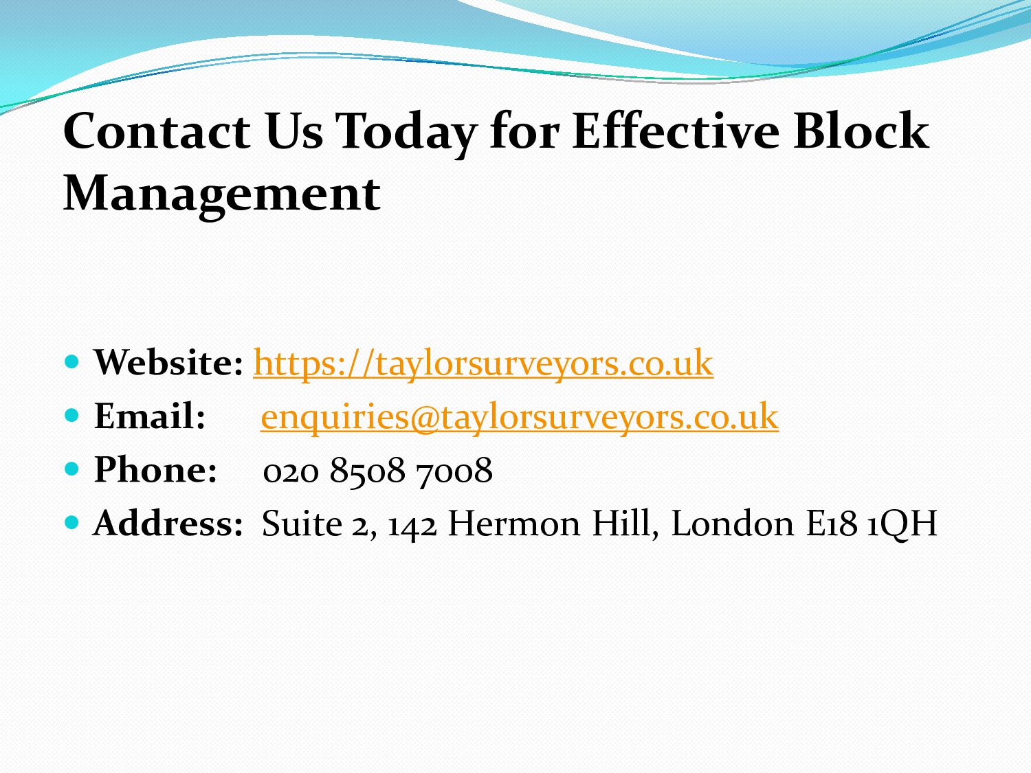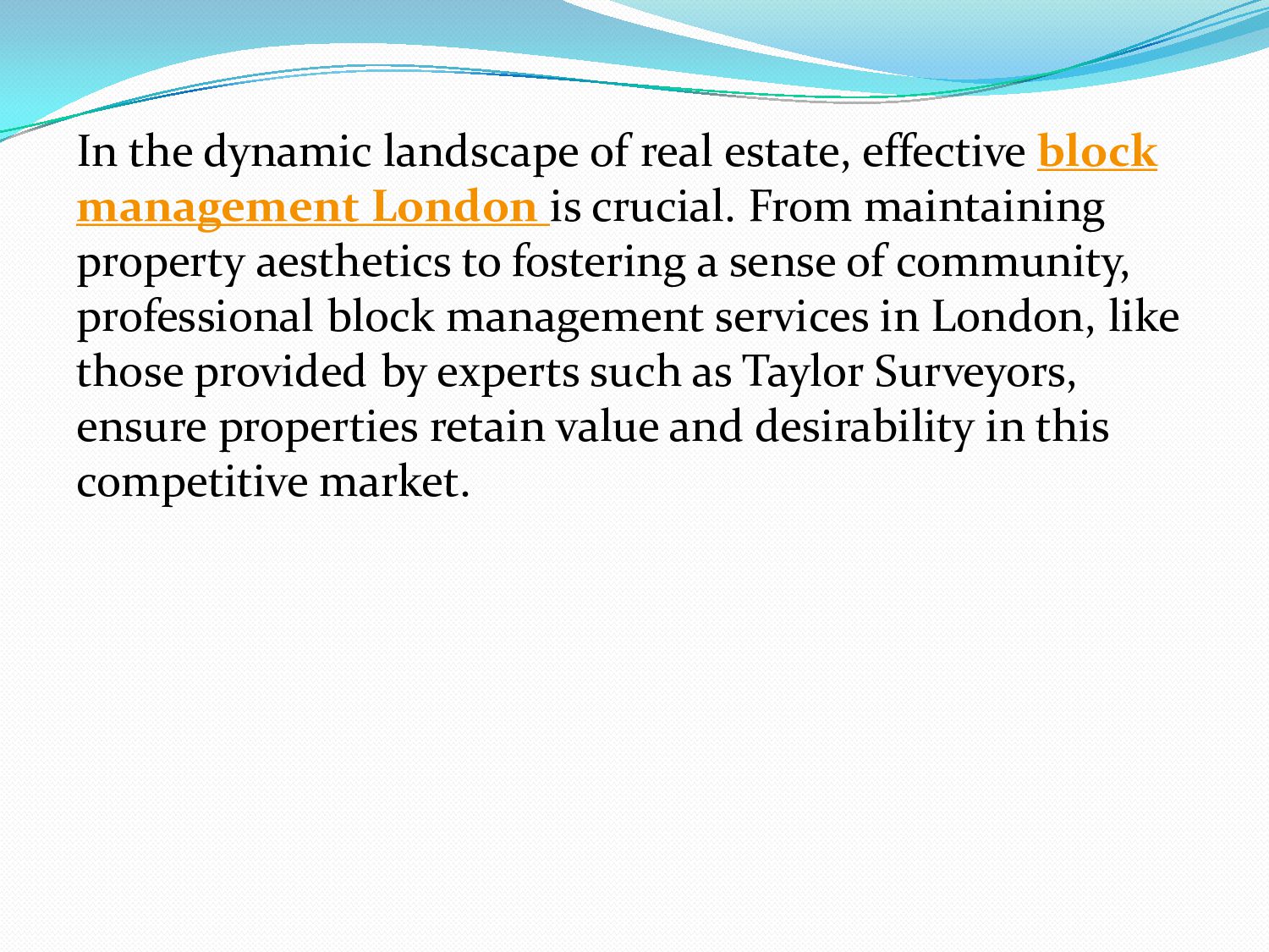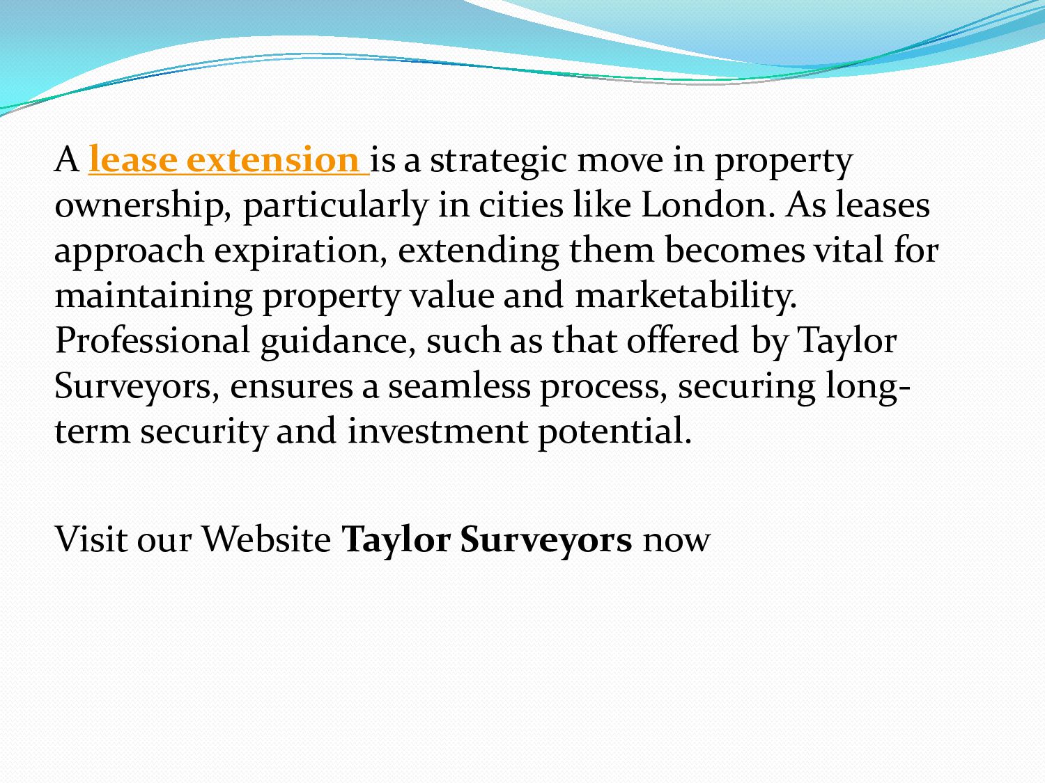 Taylor Surveyors is a trusted name in property management, offering expert guidance in London's real estate market. Their comprehensive services include strategic block management and navigating crucial processes like lease extensions. With a commitment to excellence, Taylor Surveyors ensures clients maximize property value and make informed, advantageous investment decisions.
