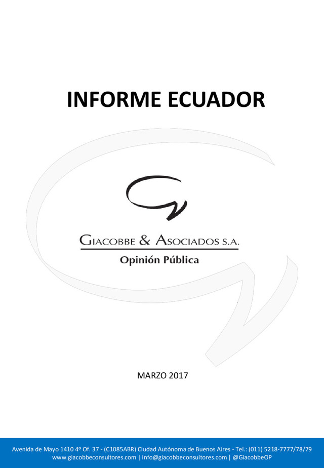 [email protected] | @GiacobbeOP Encuesta de Opinión Pública en Ecuador INFORME IMÁGENES PERSONALES 36,2% 44,1% 41,5% 37,2% 11,0% 15,4% 0% 10% 20% 30% 40% 50% 60% 70% FEB 17 MAR 17 LENÍN MORENO 36,1% 47,0% 37,8% 39,8% 14,7% 8,1% 0% 10% 20% 30% 40% 50% 60% 70% FEB 17 MAR 17 GUILLERMO LASSO