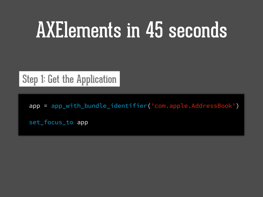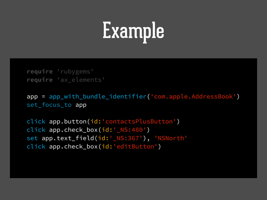 Example require 'rubygems' require 'ax_elements' app = app_with_bundle_identifier('com.apple.AddressBook') set_focus_to app