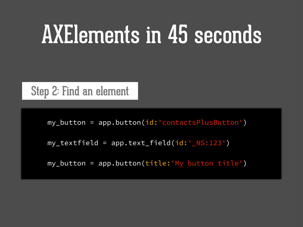 = app.button(id:'contactsPlusButton') my_textfield = app.text_field(id:'_NS:123') my_button = app.button(title:'My button title')
