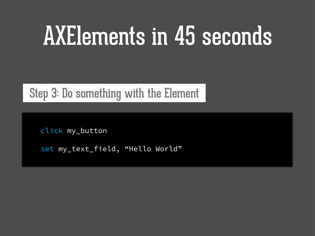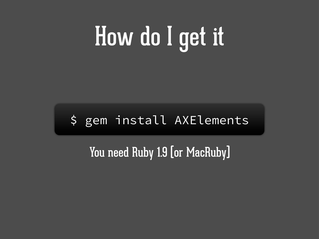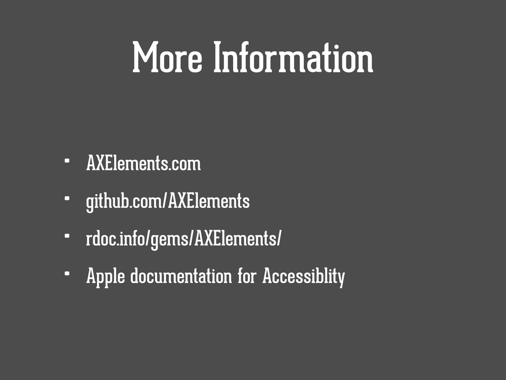 More Information • AXElements.com • github.com/AXElements • rdoc.info/gems/AXElements/ • Apple
