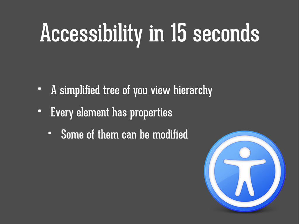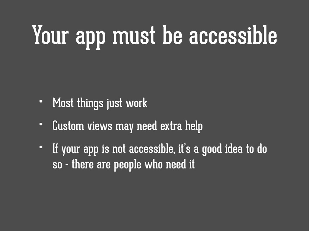 • Custom views may need extra help • If your app is not accessible, it’s a good idea to do so - there are people who need it