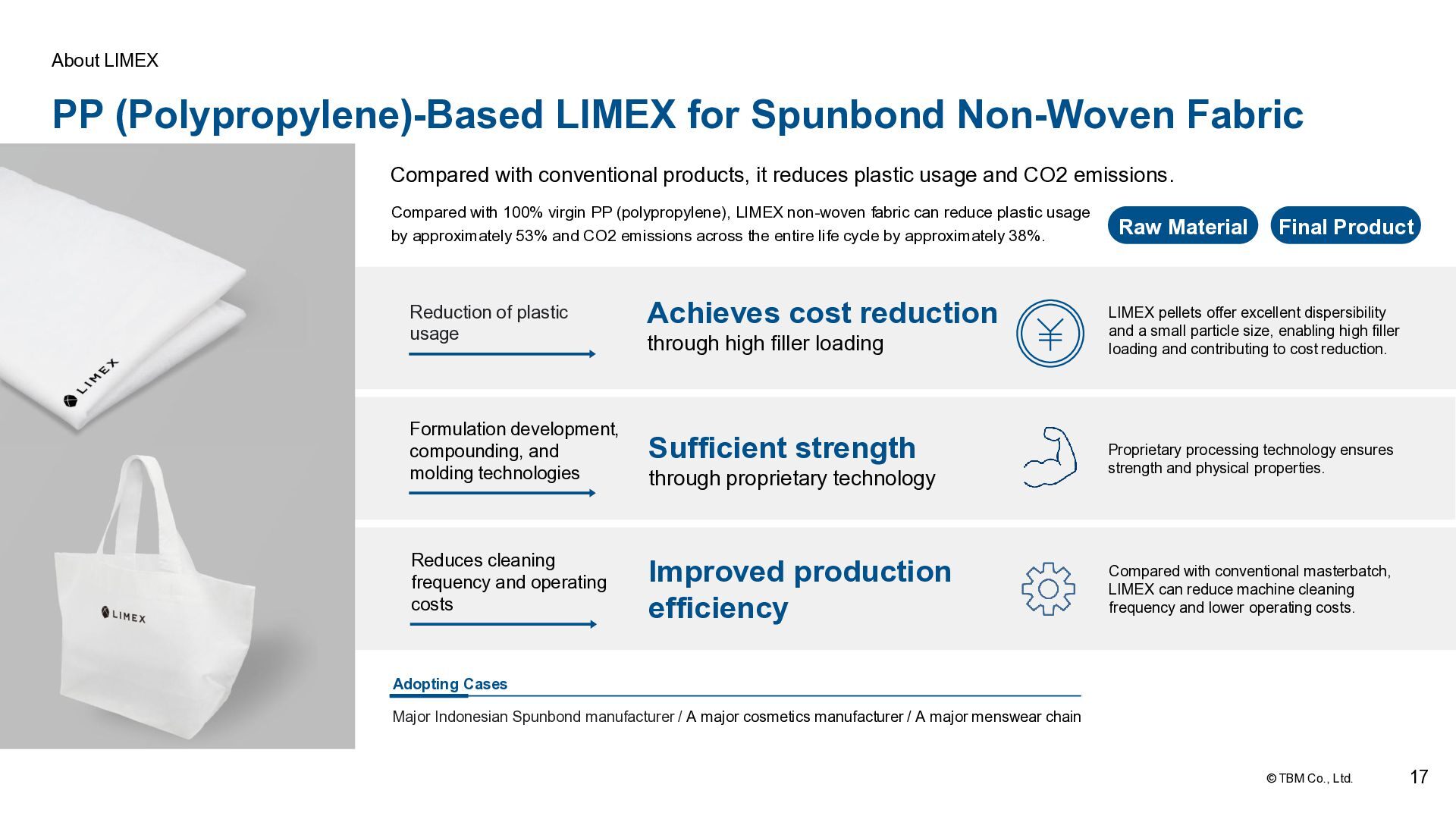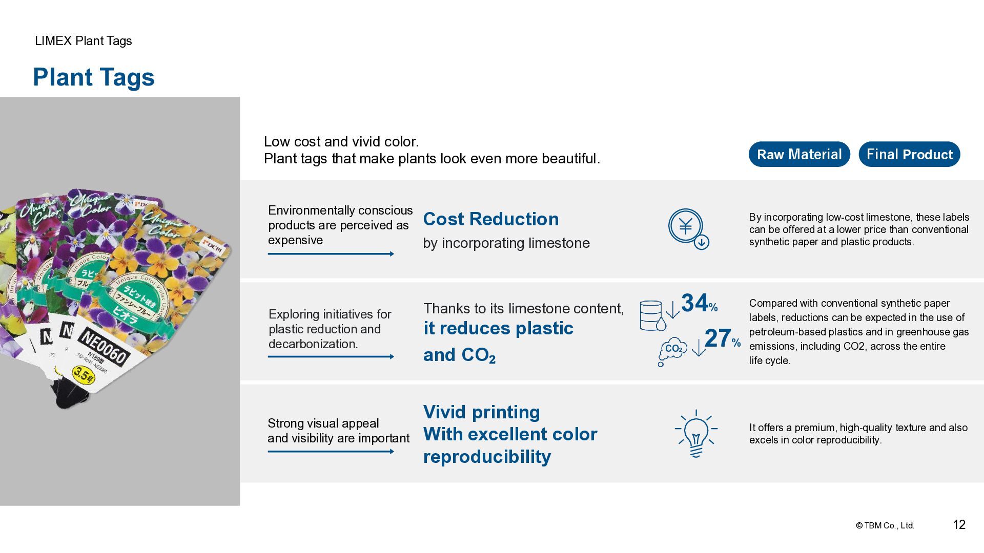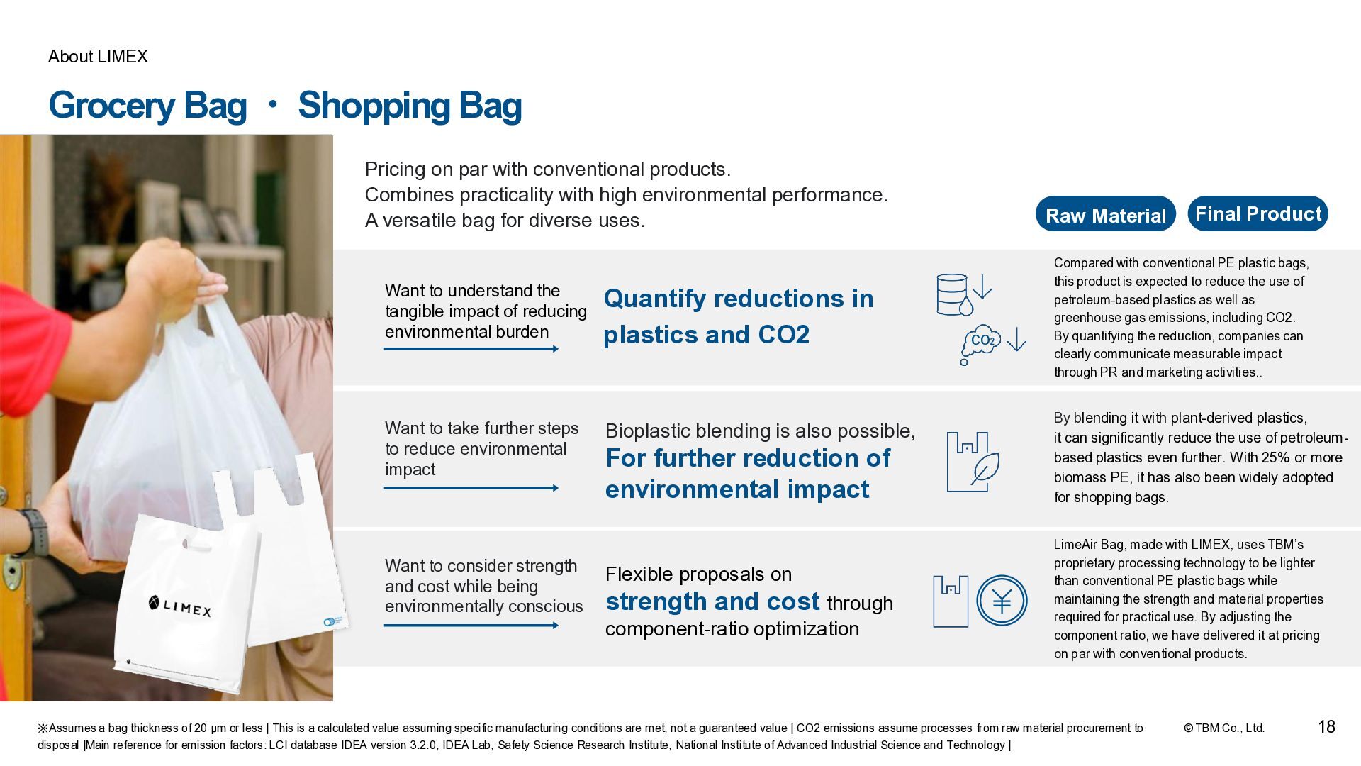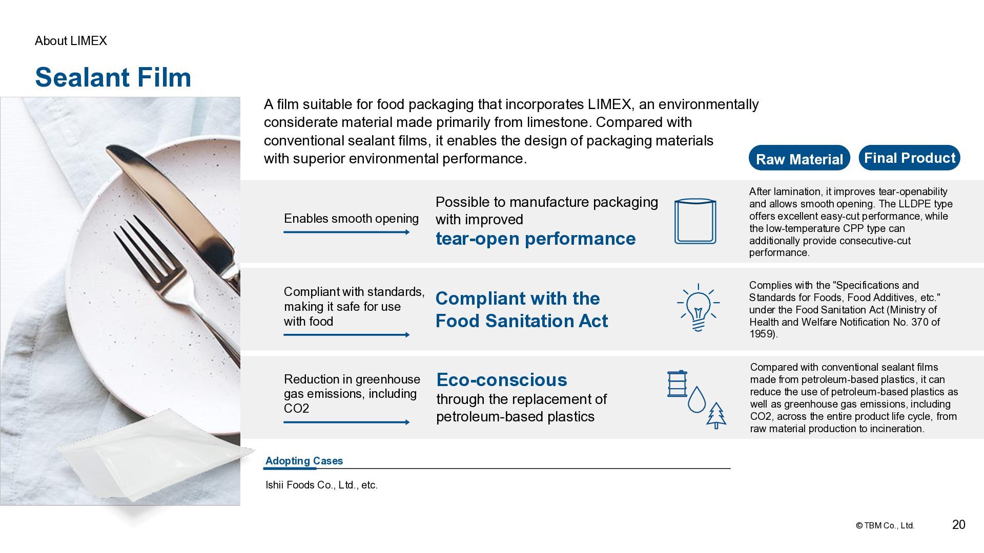 for food packaging that incorporates LIMEX, an environmentally considerate material made primarily from limestone. Compared with conventional sealant films, it enables the design of packaging materials with superior environmental performance. About LIMEX Possible to manufacture packaging with improved tear-open performance After lamination, it improves tear-openability and allows smooth opening. The LLDPE type offers excellent easy-cut performance, while the low-temperature CPP type can additionally provide consecutive-cut performance. Enables smooth opening Eco-conscious through the replacement of petroleum-based plastics Reduction in greenhouse gas emissions, including CO2 Compared with conventional sealant films made from petroleum-based plastics, it can reduce the use of petroleum-based plastics as well as greenhouse gas emissions, including CO2, across the entire product life cycle, from raw material production to incineration. Compliant with the Food Sanitation Act Complies with the "Specifications and Standards for Foods, Food Additives, etc." under the Food Sanitation Act (Ministry of Health and Welfare Notification No. 370 of 1959). Compliant with standards, making it safe for use with food Raw Material Final Product Adopting Cases Ishii Foods Co., Ltd., etc.