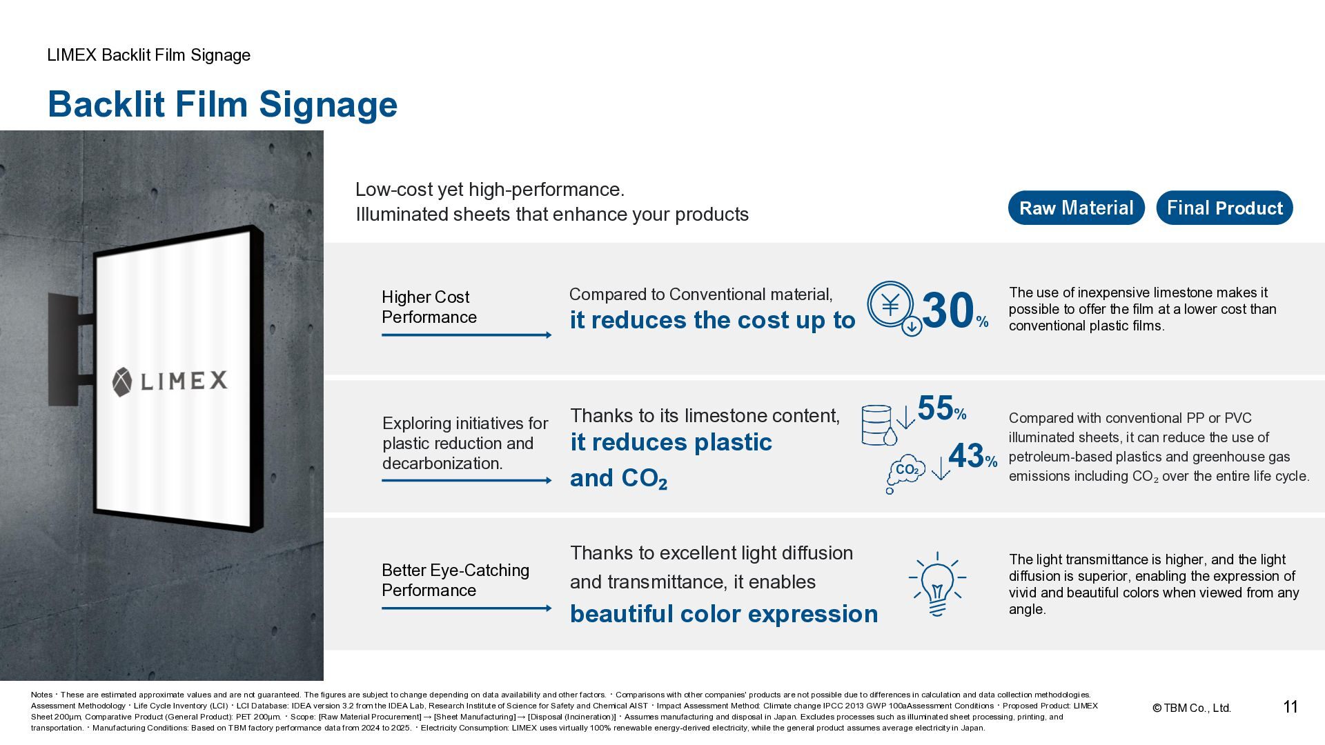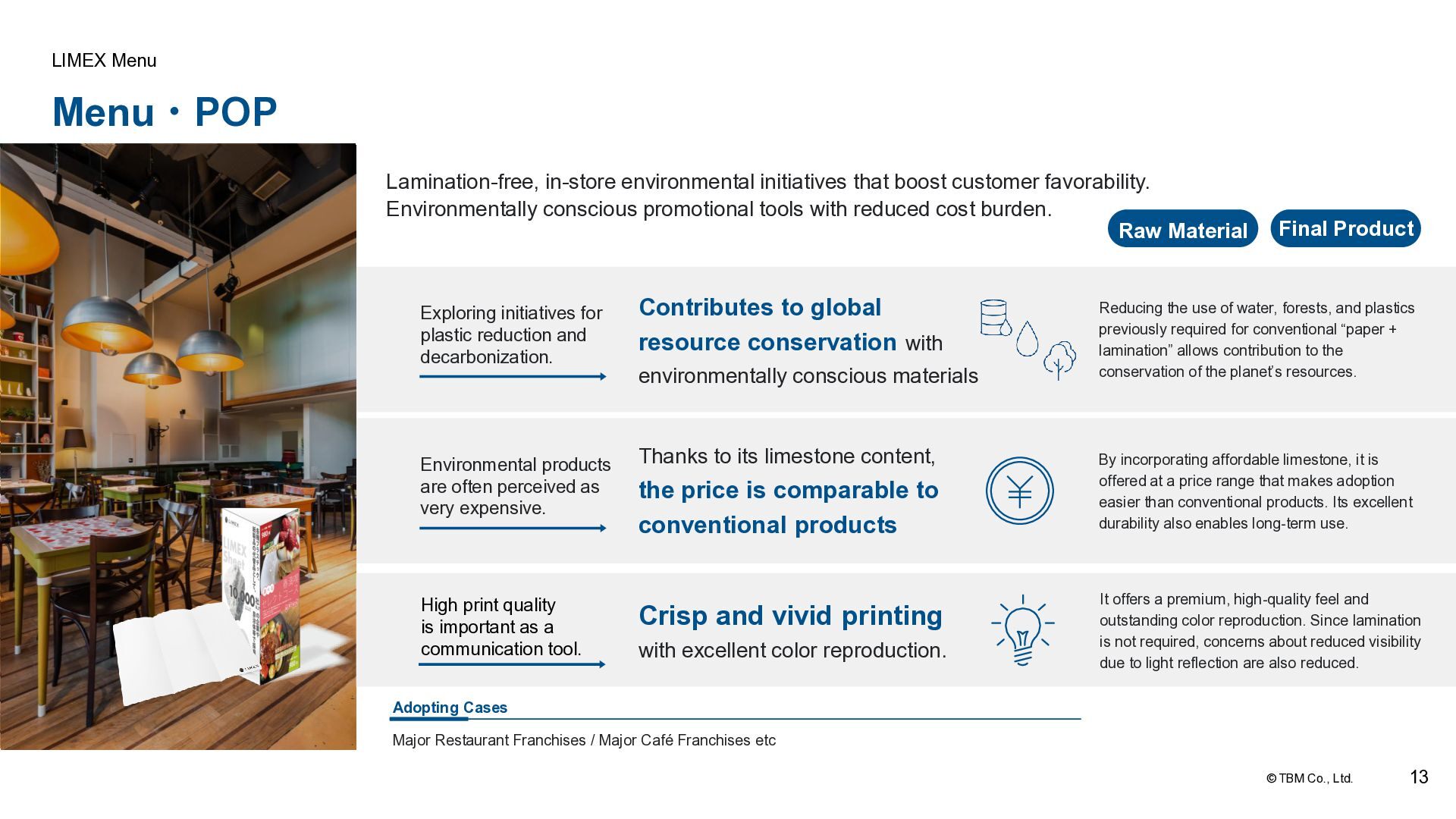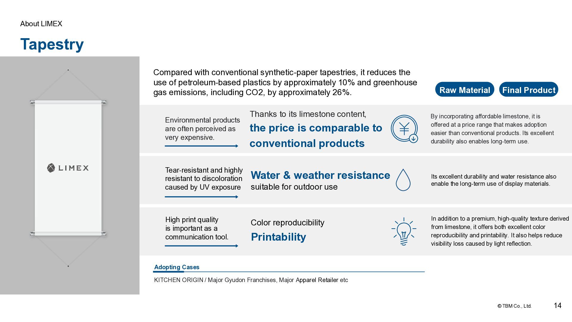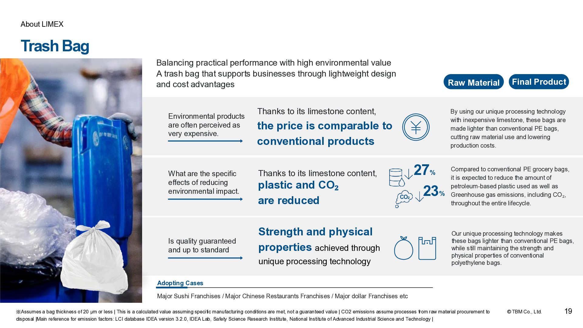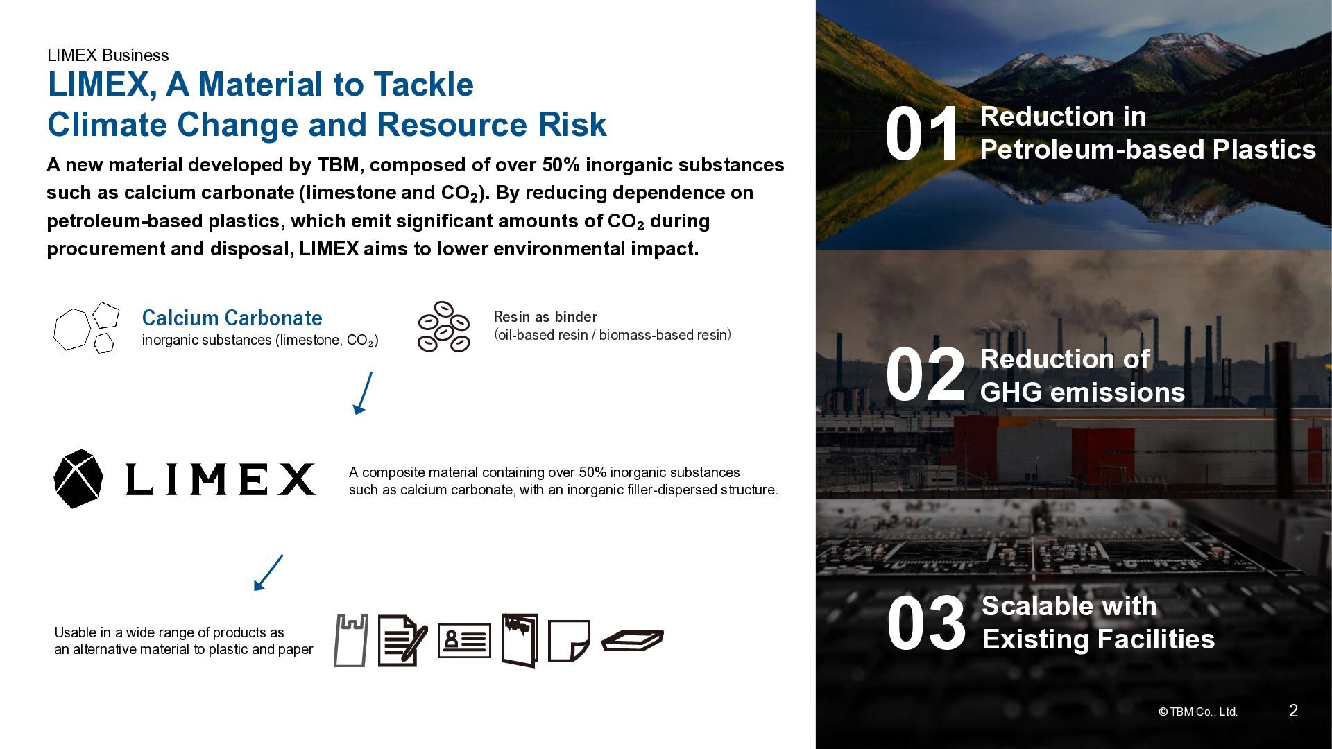 for food packaging that incorporates LIMEX, an environmentally considerate material made primarily from limestone. Compared with conventional sealant films, it enables the design of packaging materials with superior environmental performance. About LIMEX Possible to manufacture packaging with improved tear-open performance After lamination, it improves tear-openability and allows smooth opening. The LLDPE type offers excellent easy-cut performance, while the low-temperature CPP type can additionally provide consecutive-cut performance. Enables smooth opening Eco-conscious through the replacement of petroleum-based plastics Reduction in greenhouse gas emissions, including CO2 Compared with conventional sealant films made from petroleum-based plastics, it can reduce the use of petroleum-based plastics as well as greenhouse gas emissions, including CO2, across the entire product life cycle, from raw material production to incineration. Compliant with the Food Sanitation Act Complies with the "Specifications and Standards for Foods, Food Additives, etc." under the Food Sanitation Act (Ministry of Health and Welfare Notification No. 370 of 1959). Compliant with standards, making it safe for use with food Raw Material Final Product Adopting Cases Ishii Foods Co., Ltd., etc.