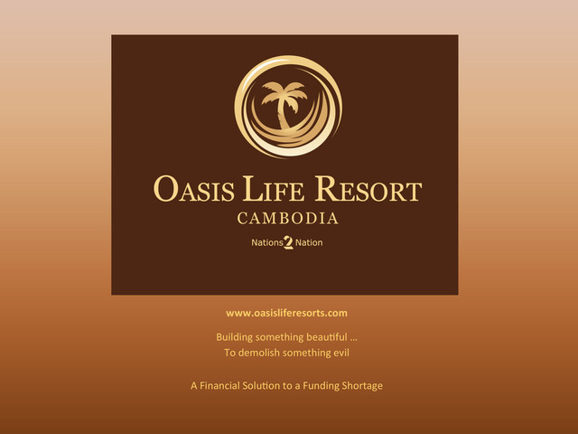 • Stage1: Secure LAND at $15perSqM (vs. recent $65 that went for $90) • 2 HECTARES FOR RESORT • $300,000 • 1 HECTARE FOR CONFERENCE/ HOSPITALITY ACADEMY / VOCATIONAL TRAINING CENTRE • $150,000 • Stage2: BUILD • $1,600,000 • PROFITS • $450,000 -‐ $660,000 PA (Tax concessions) CAPITALISM MULTIPLYER • $2,000,000 • $3,200,000 PROFITS 7 YEARS • BUSINESS SALE • PROCEEDS FUND TWO MORE • $6,400,000 NEXT 7 YEARS • TOTAL IN 14 YEARS • $9,600,000