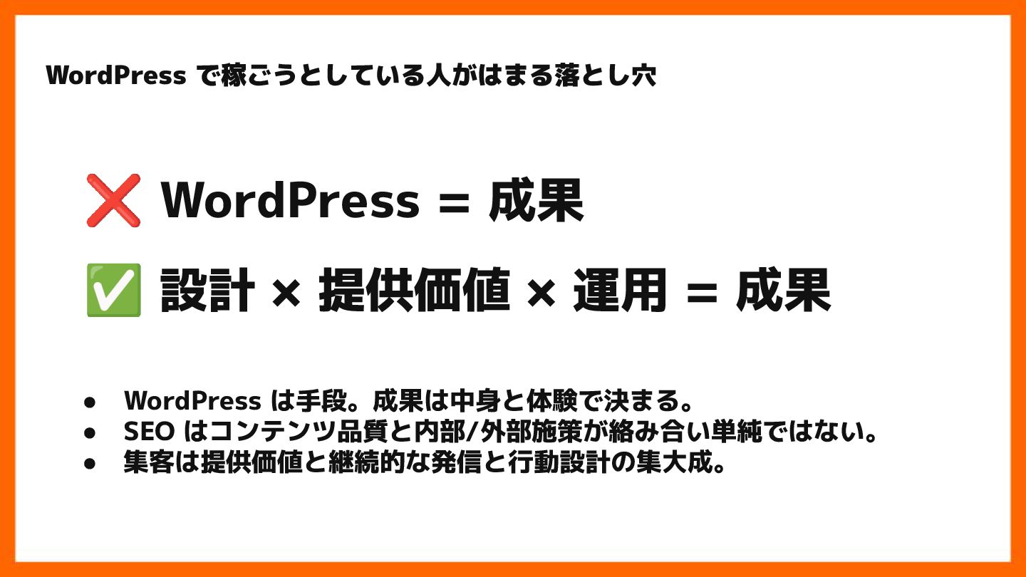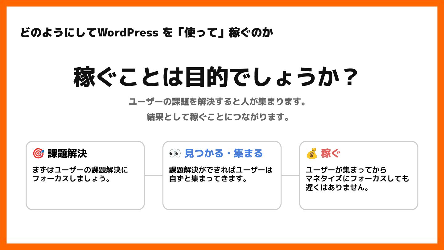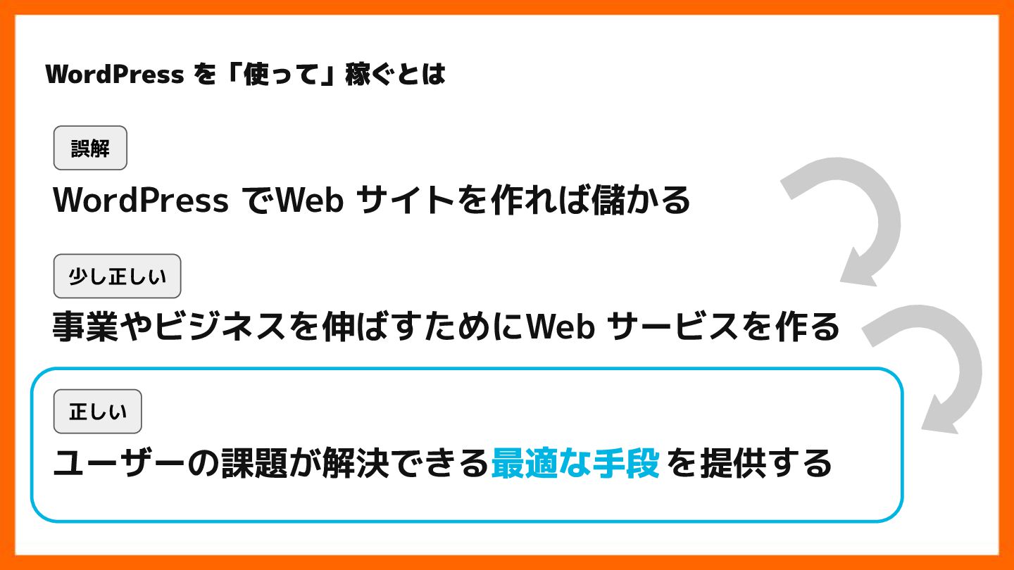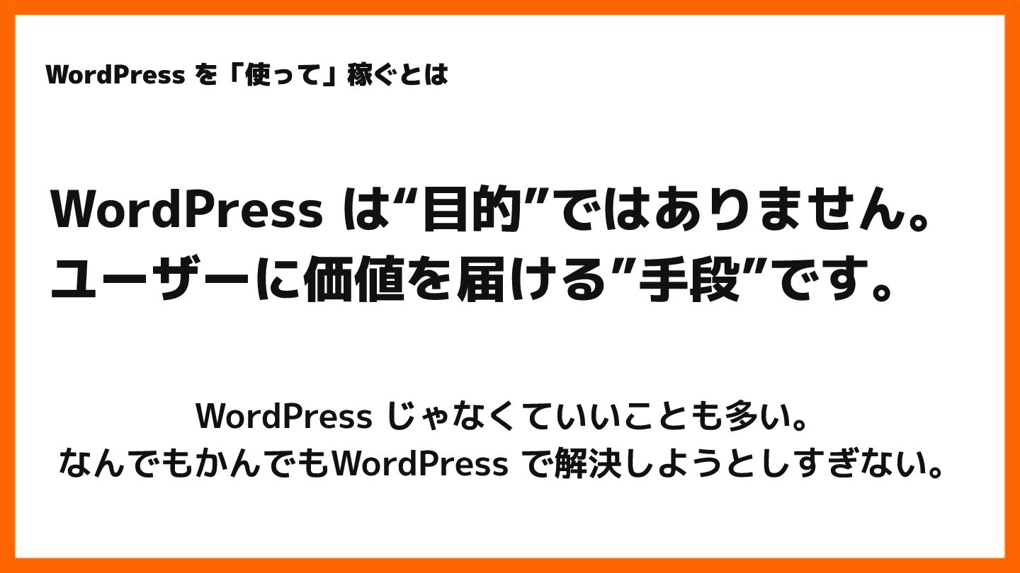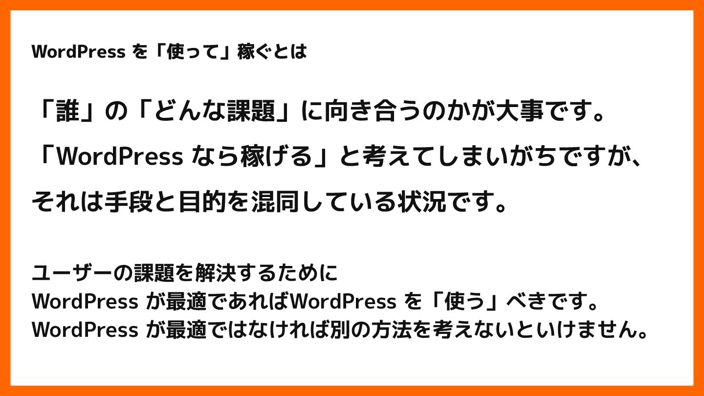 本セッションは、WordPress を「目的」ではなく「手段」として使うための考え方と手順をまとめたものです。2018年の WordCamp Osaka での気づきを起点に、「WordPress で稼ぐ=肩書きで仕事を取る」発想から抜け出し、ユーザーの課題を起点に価値をつくる方向へシフトすることを提案しています。