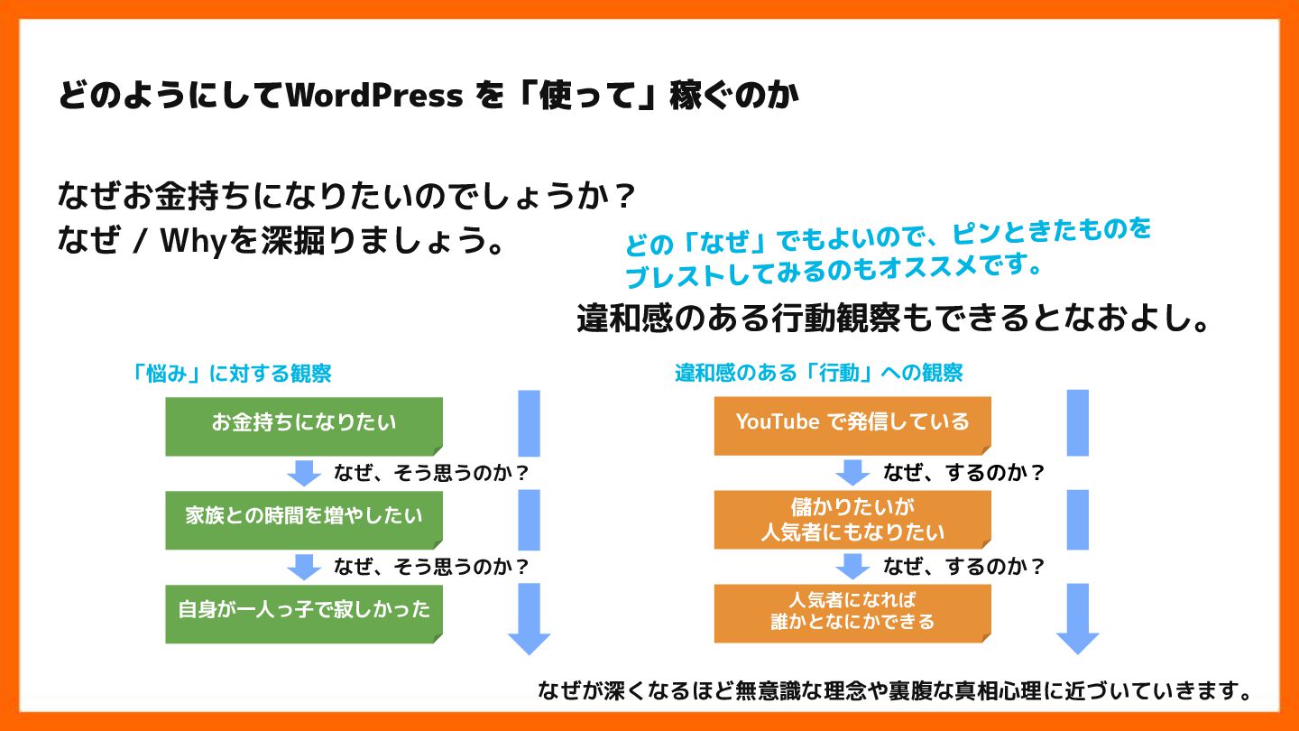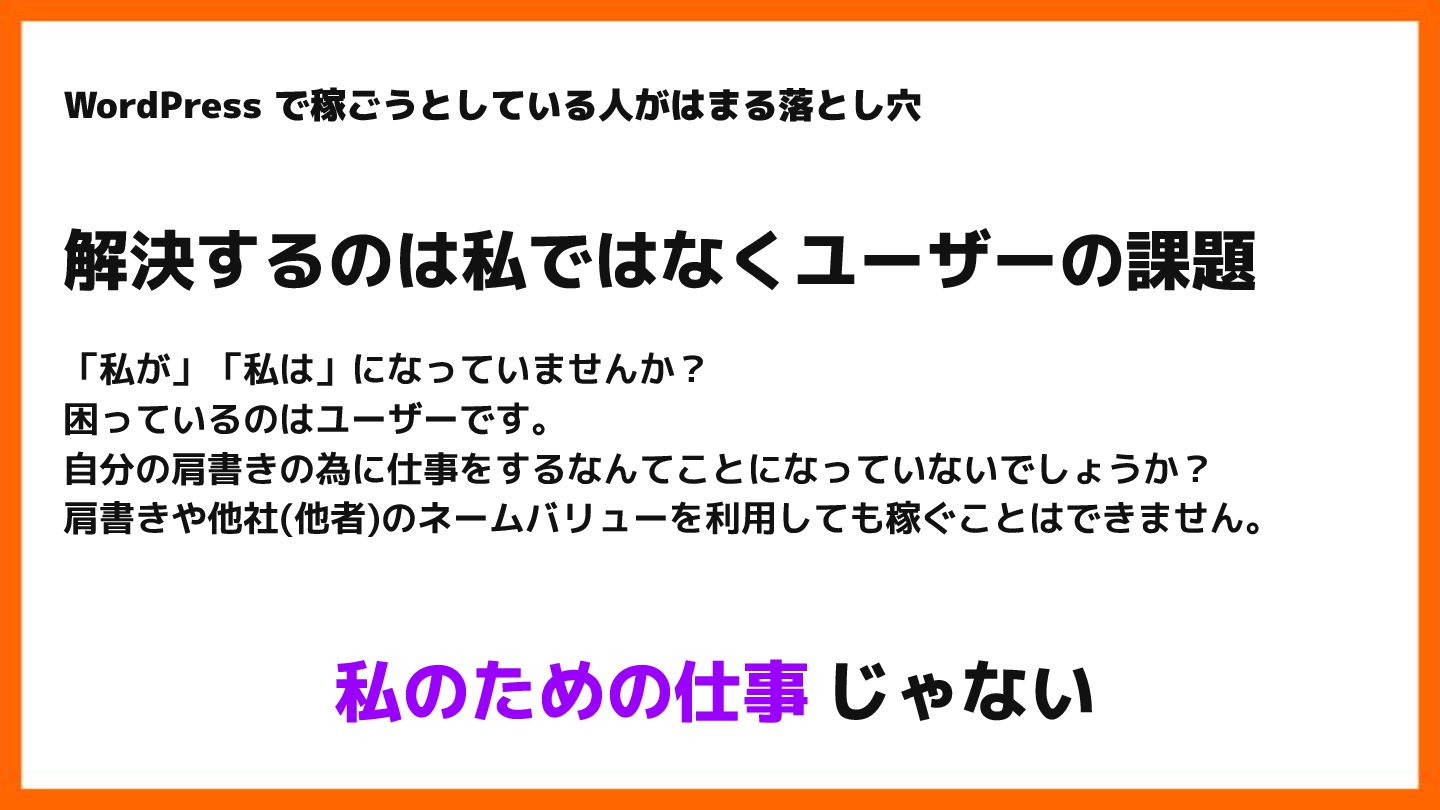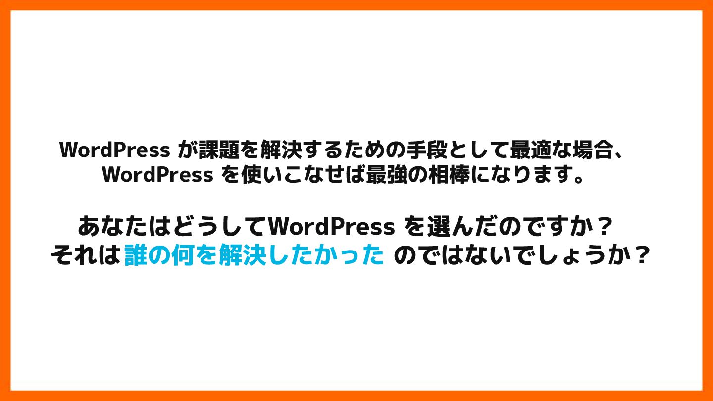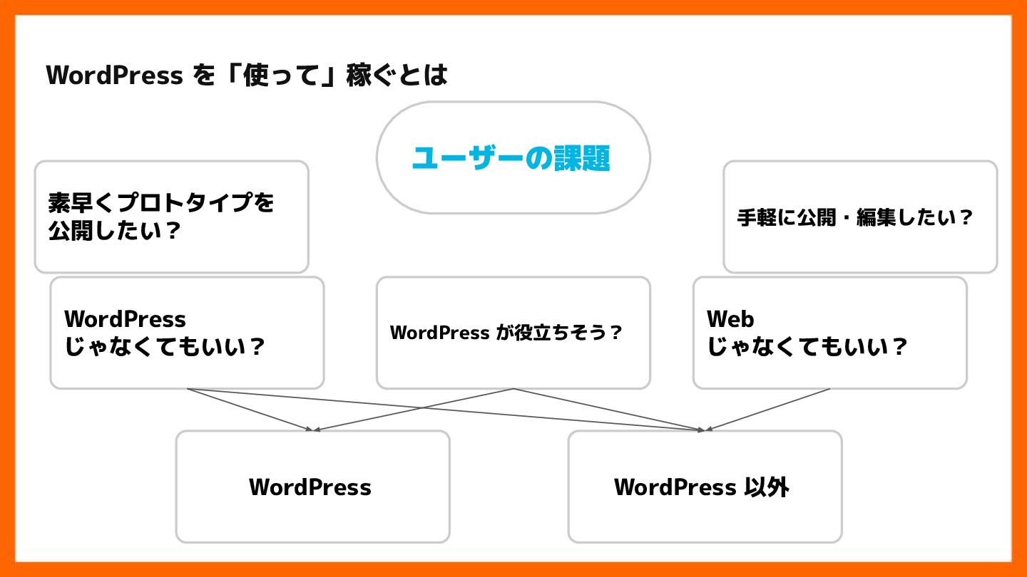 本セッションは、WordPress を「目的」ではなく「手段」として使うための考え方と手順をまとめたものです。2018年の WordCamp Osaka での気づきを起点に、「WordPress で稼ぐ=肩書きで仕事を取る」発想から抜け出し、ユーザーの課題を起点に価値をつくる方向へシフトすることを提案しています。