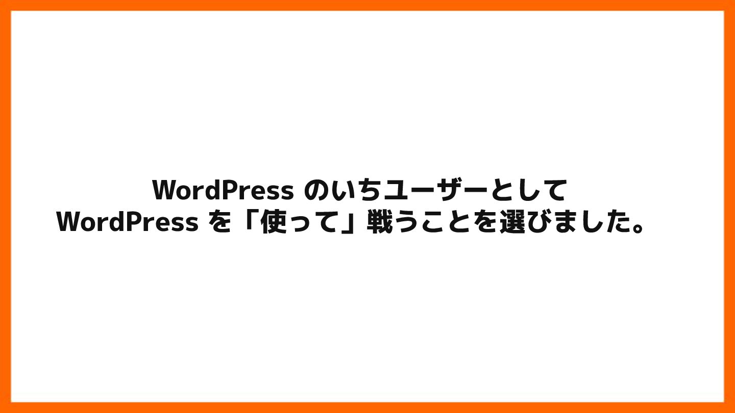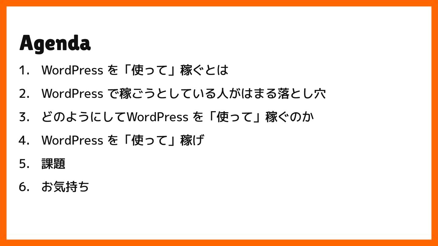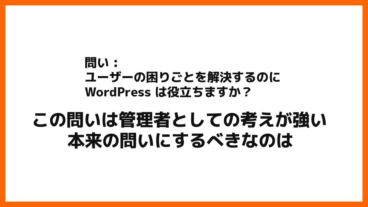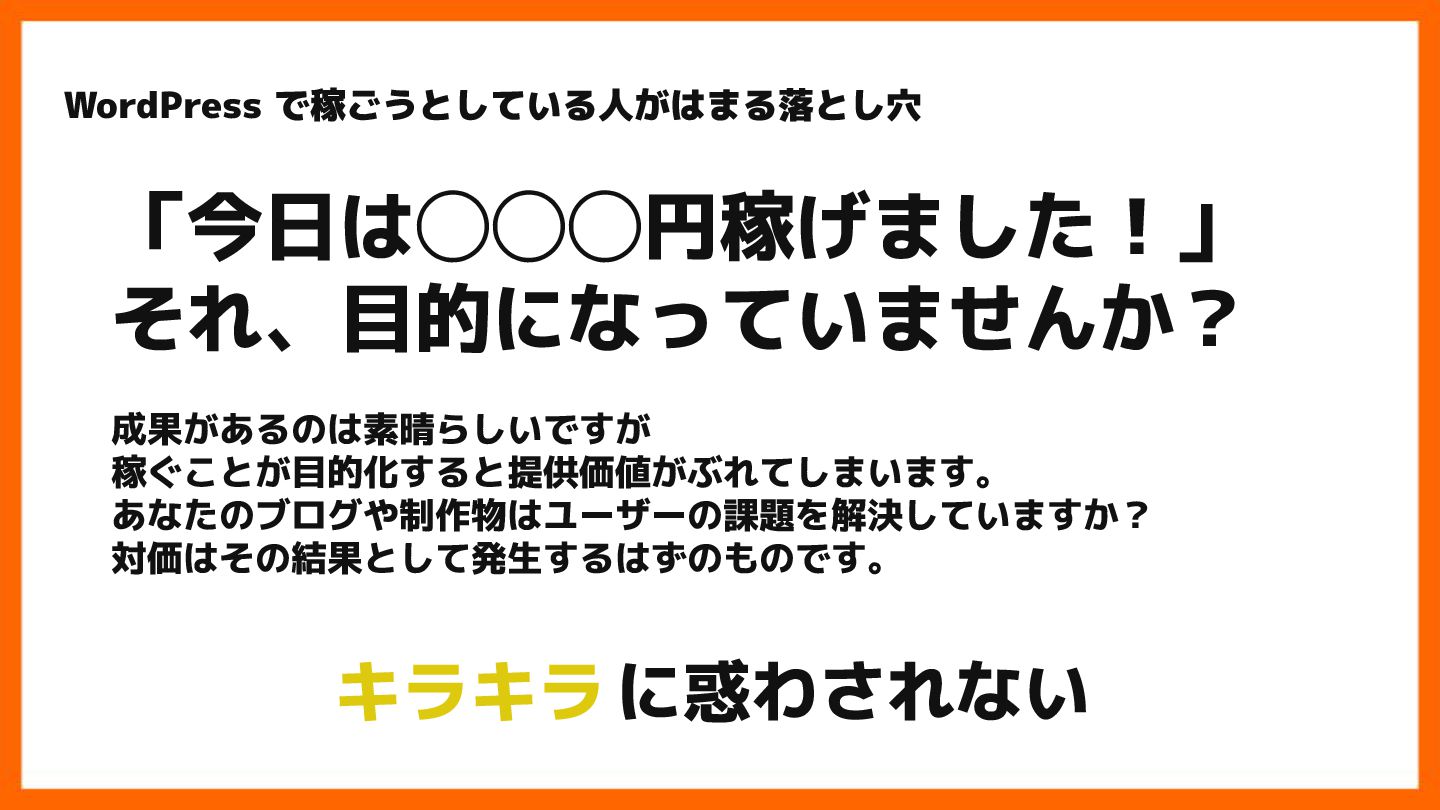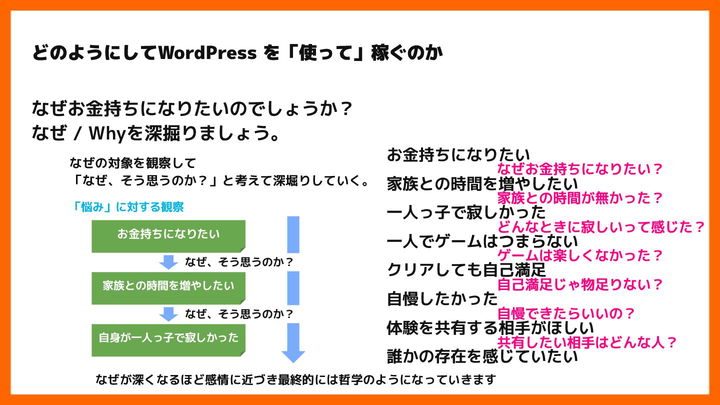 本セッションは、WordPress を「目的」ではなく「手段」として使うための考え方と手順をまとめたものです。2018年の WordCamp Osaka での気づきを起点に、「WordPress で稼ぐ=肩書きで仕事を取る」発想から抜け出し、ユーザーの課題を起点に価値をつくる方向へシフトすることを提案しています。