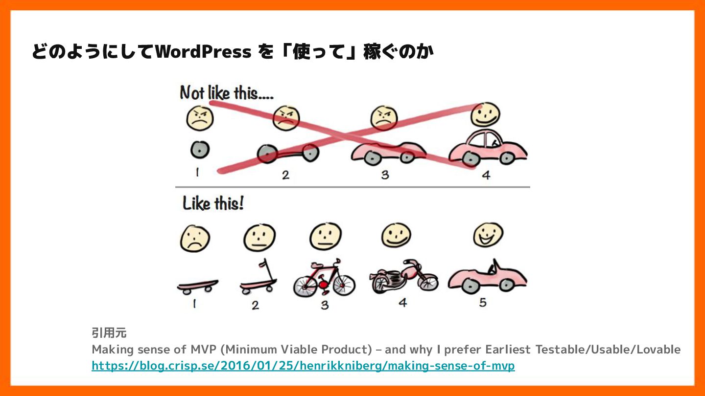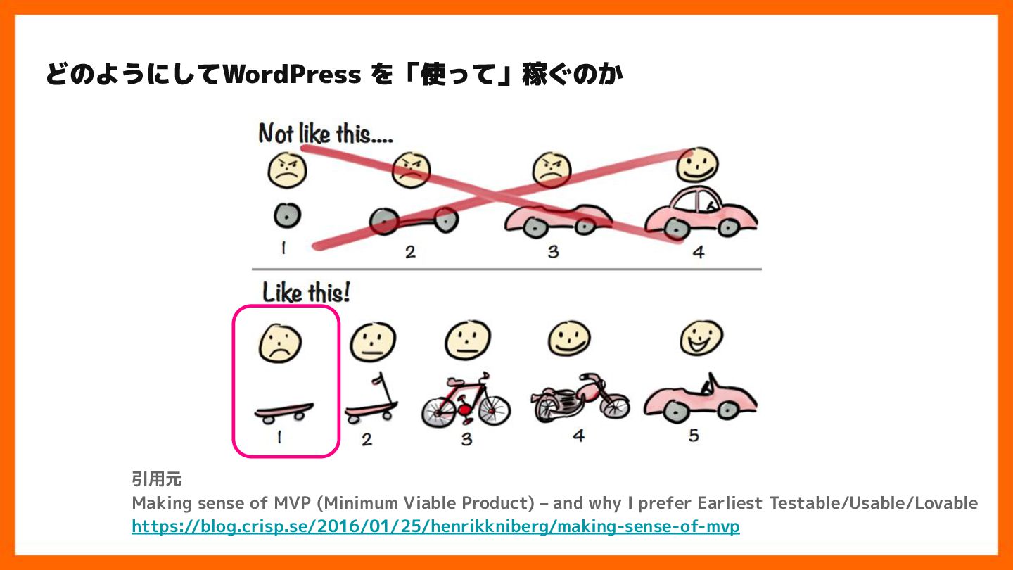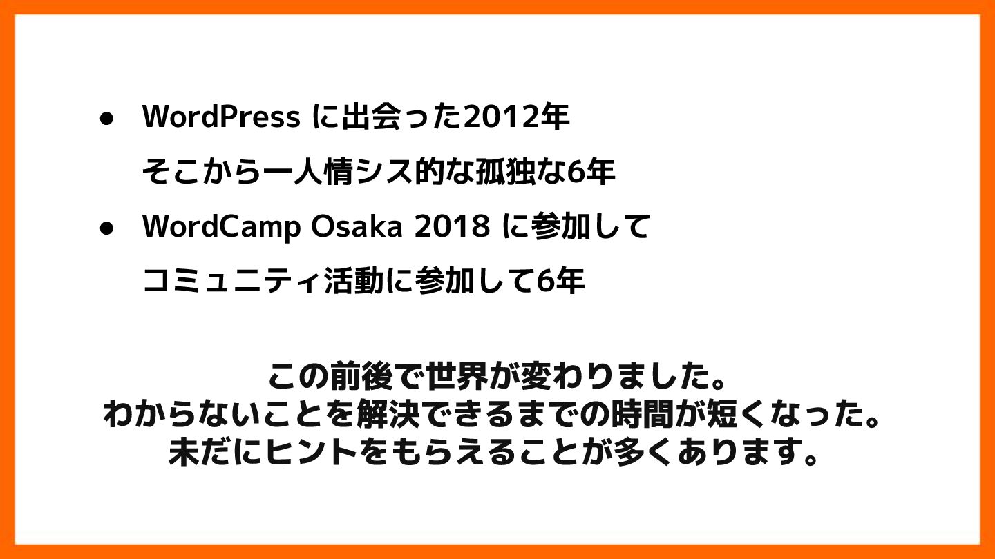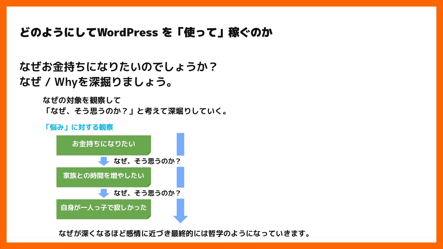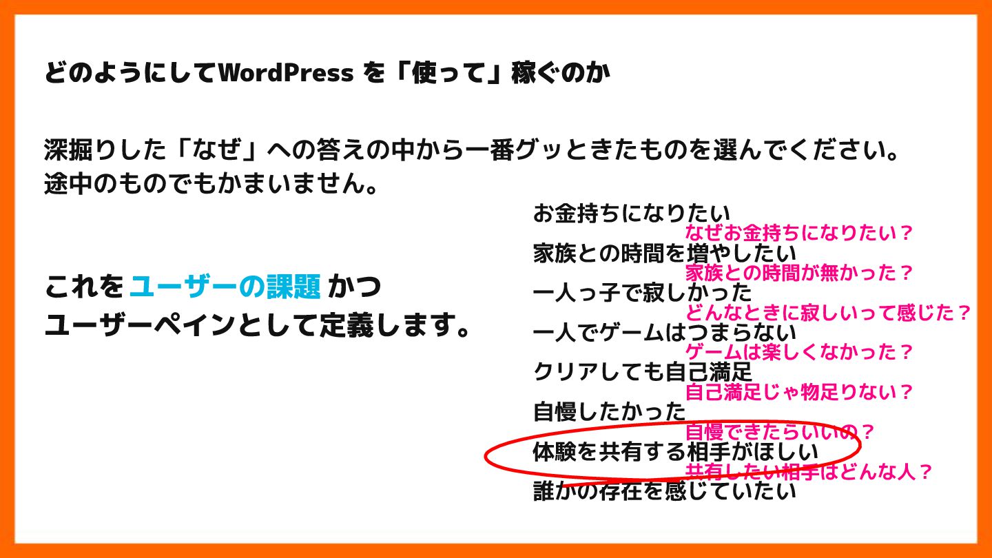 本セッションは、WordPress を「目的」ではなく「手段」として使うための考え方と手順をまとめたものです。2018年の WordCamp Osaka での気づきを起点に、「WordPress で稼ぐ=肩書きで仕事を取る」発想から抜け出し、ユーザーの課題を起点に価値をつくる方向へシフトすることを提案しています。