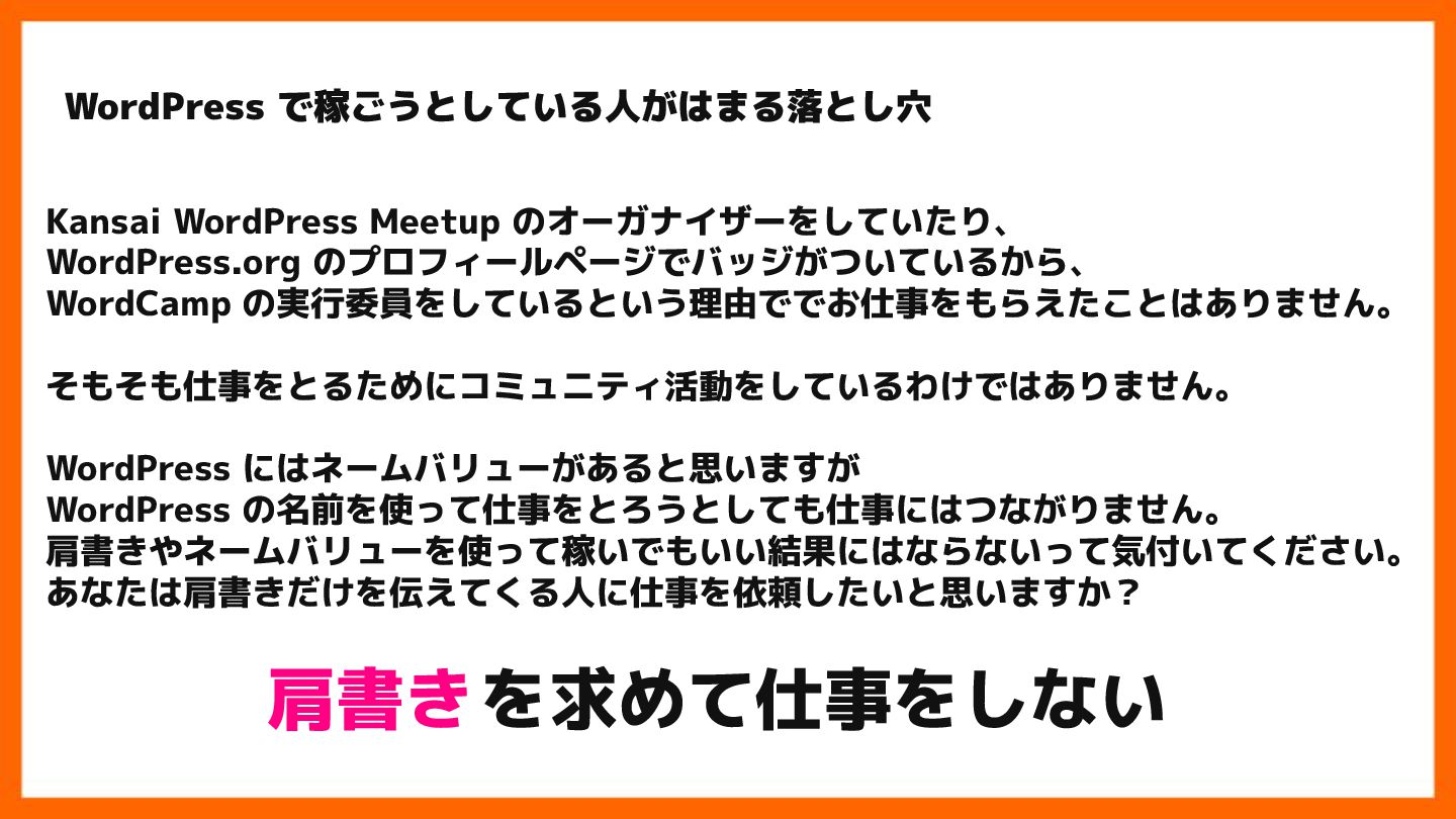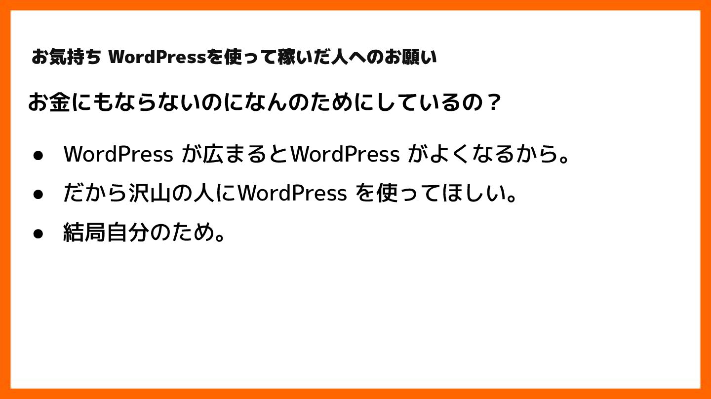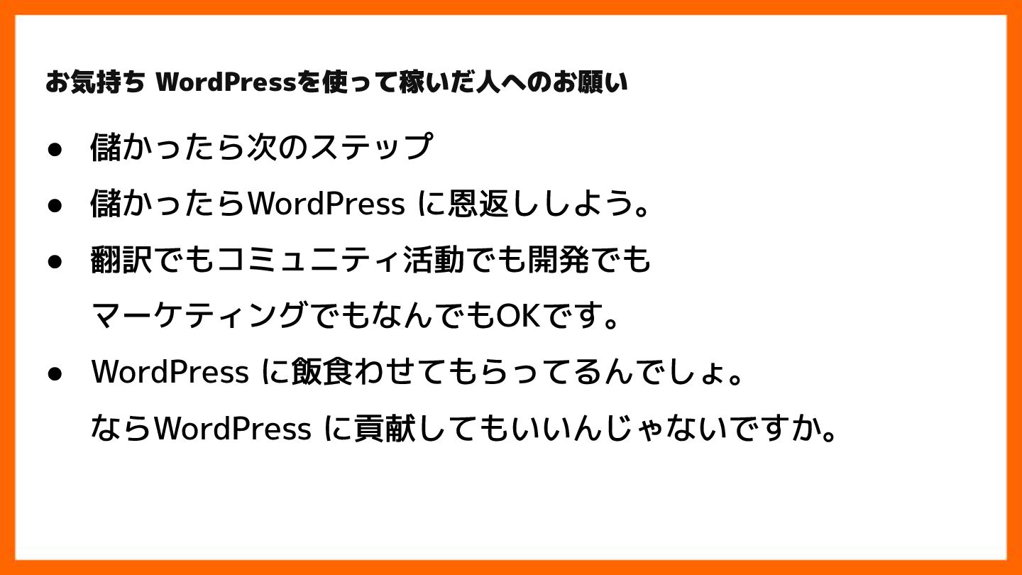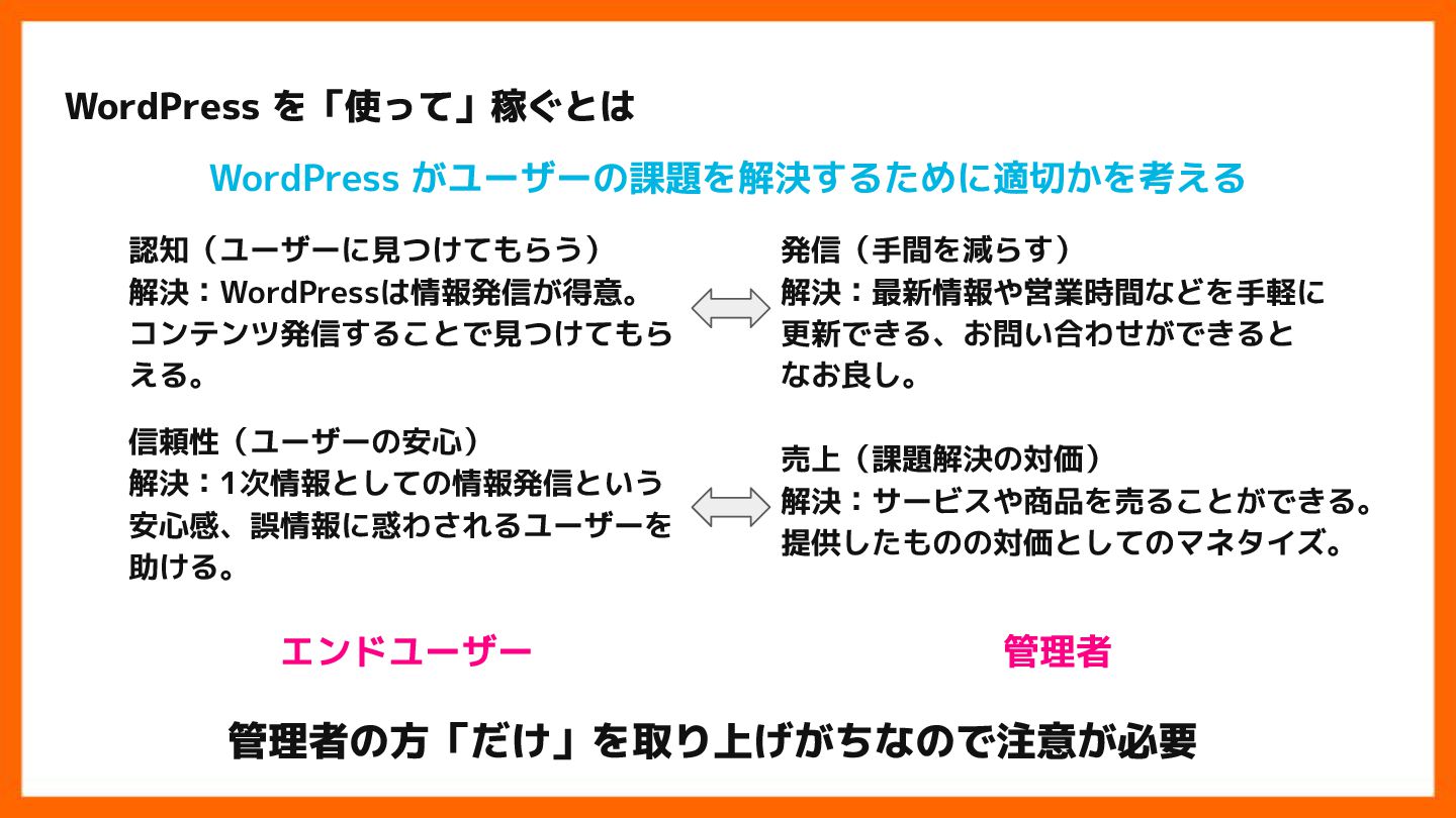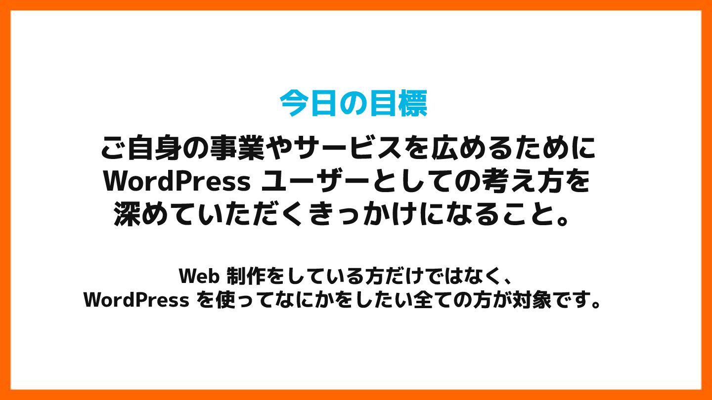 Web 制作に限らず、WordPress を使って事業・サービス・コミュニティを広めたい人、そして「稼げたら WordPress に還元する」という循環をつくりたい人に向けた内容です。