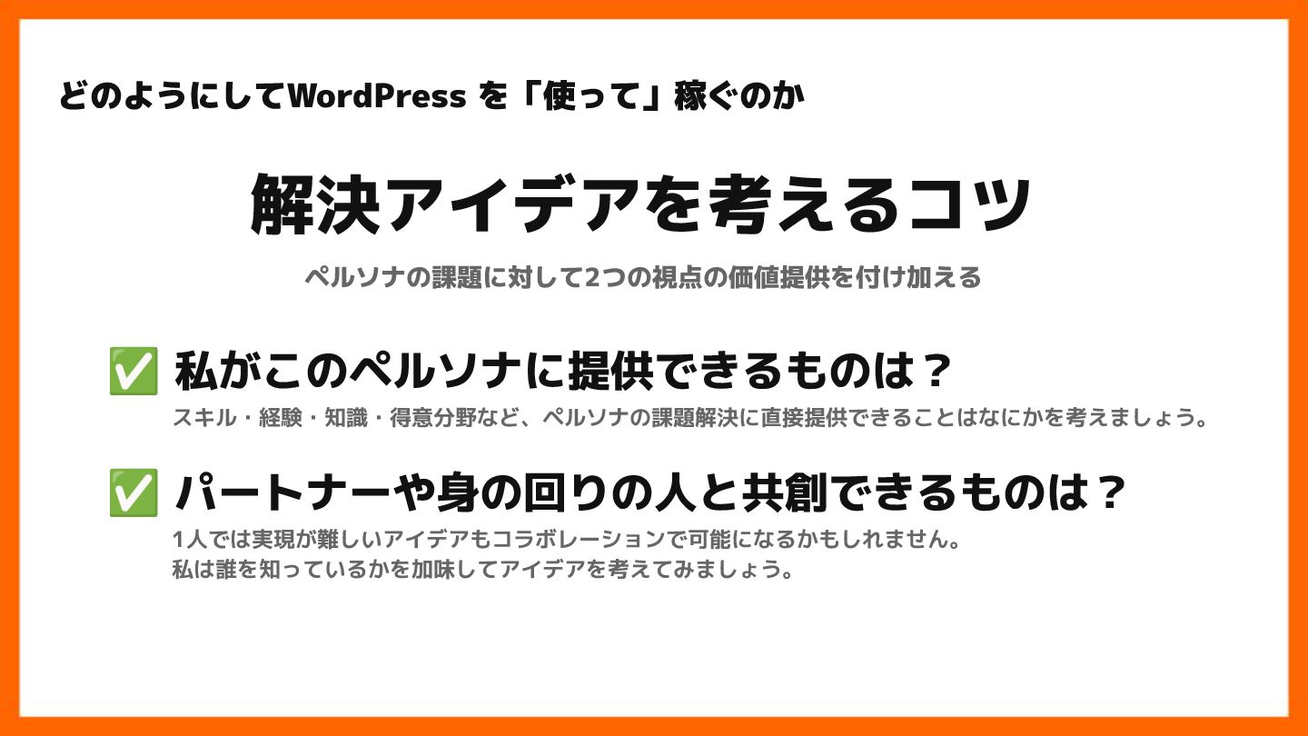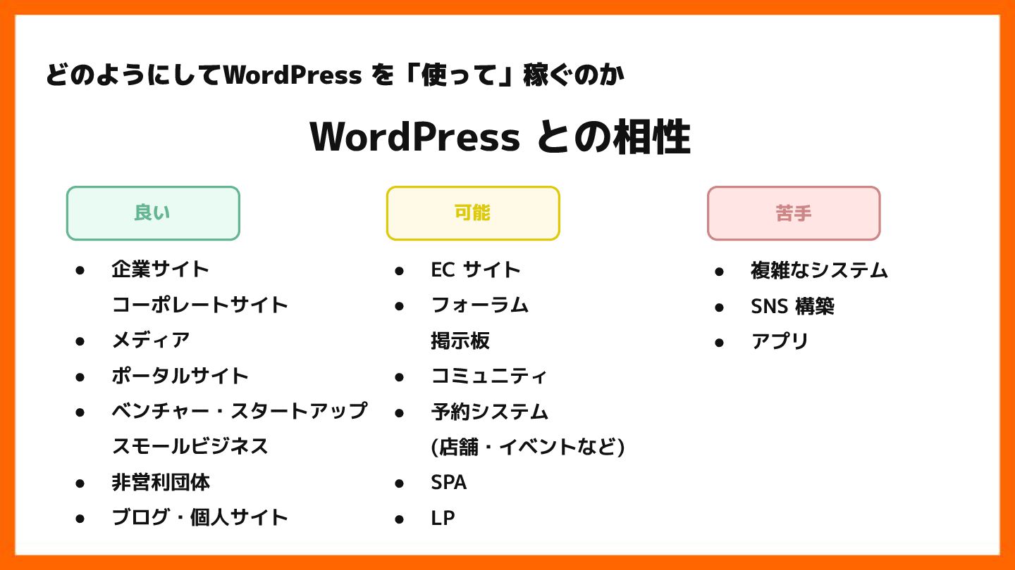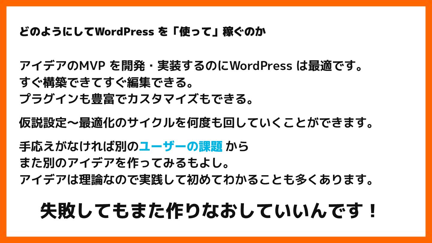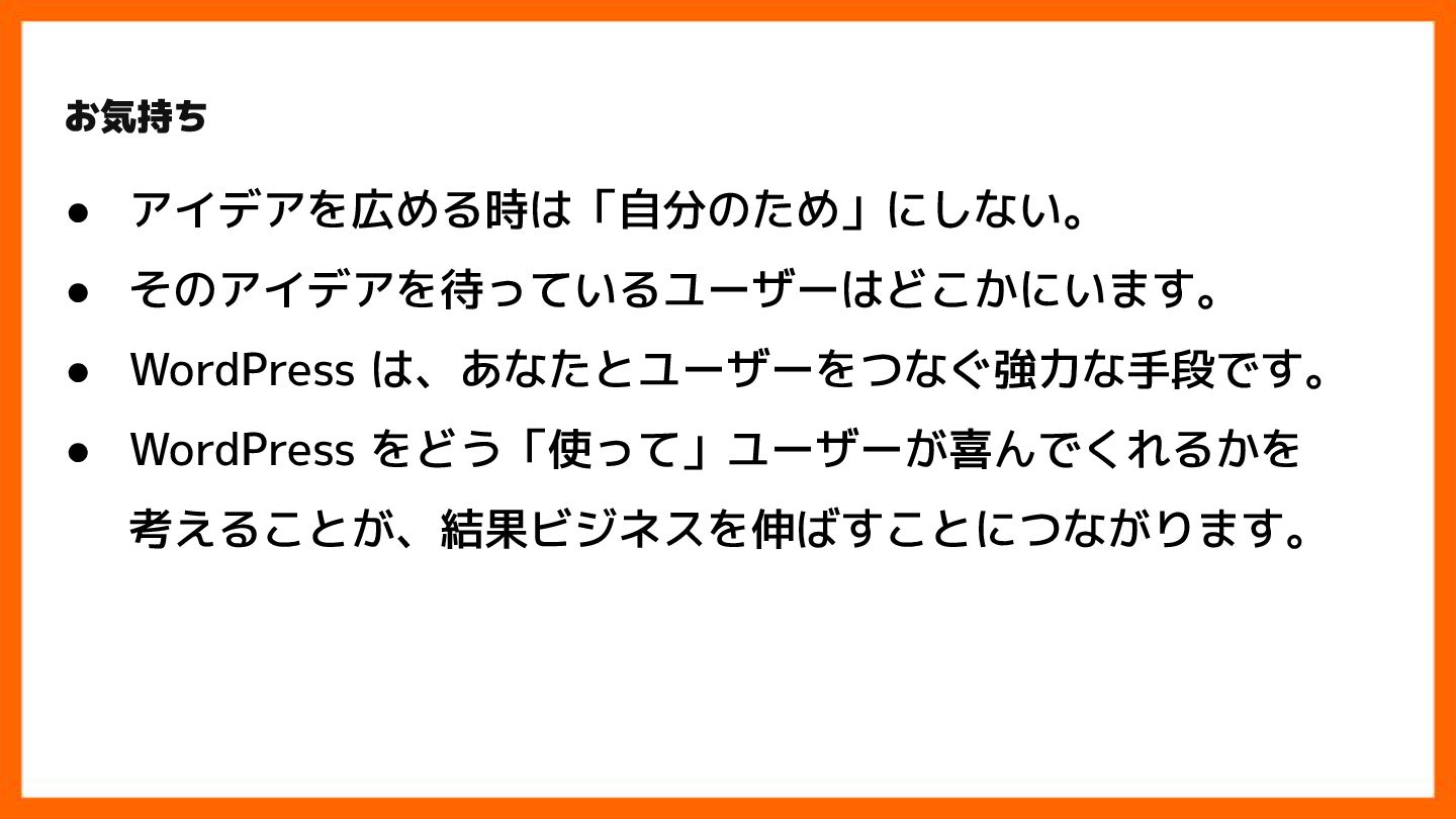 Web 制作に限らず、WordPress を使って事業・サービス・コミュニティを広めたい人、そして「稼げたら WordPress に還元する」という循環をつくりたい人に向けた内容です。