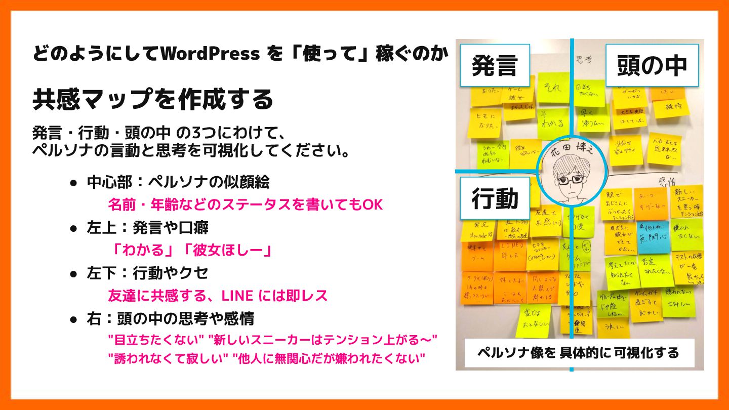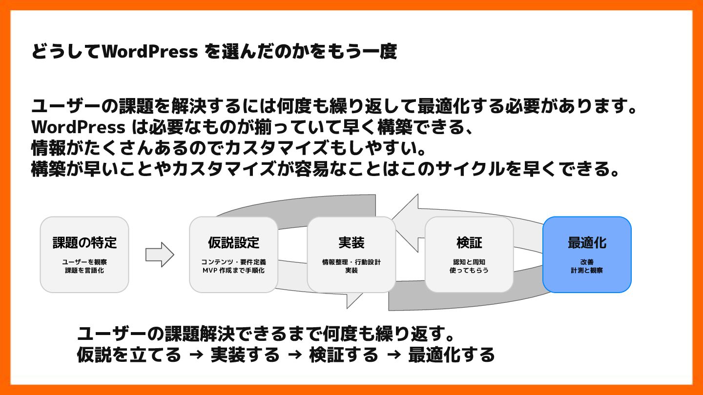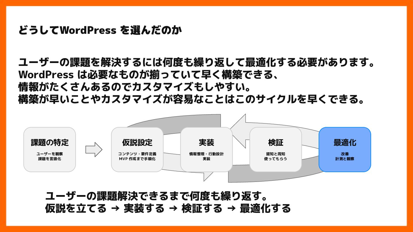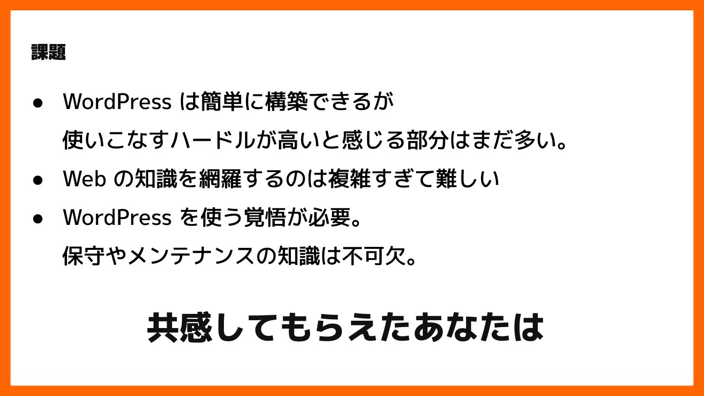 セッション内では、「WordPress だからSEOに強い」「インストールすれば集客できる」「コミュニティの肩書きで仕事がとれる」 といった“よくある誤解”や、WordPress に「使われてしまう」状態を取り上げ、それをどう回避するかを紹介します。そのうえで、誰の・どんな課題を解決するのかを深掘りし、ペルソナ・共感マップ・ストーリーボードでアイデアを形にし、WordPress で MVP を素早く公開して検証する流れを解説しています。