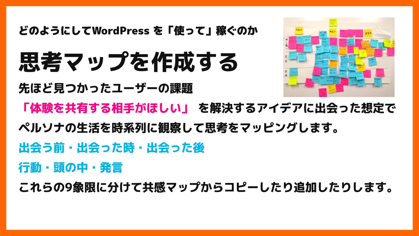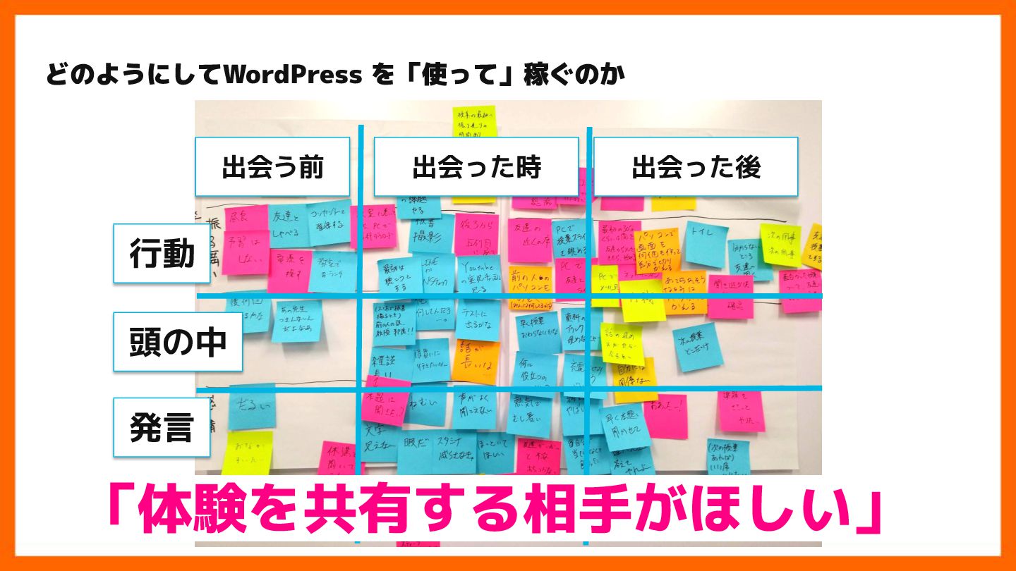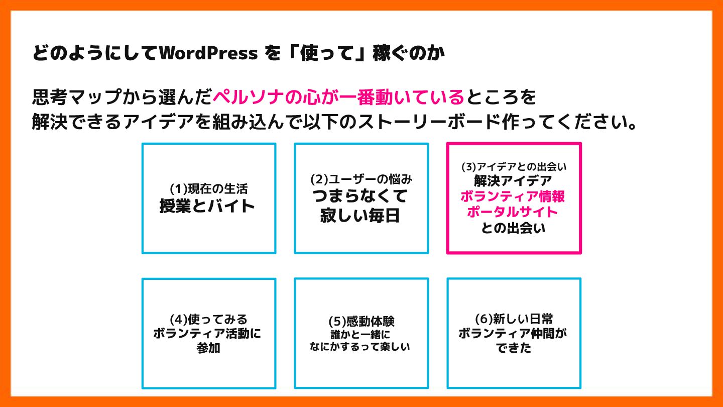 セッション内では、「WordPress だからSEOに強い」「インストールすれば集客できる」「コミュニティの肩書きで仕事がとれる」 といった“よくある誤解”や、WordPress に「使われてしまう」状態を取り上げ、それをどう回避するかを紹介します。そのうえで、誰の・どんな課題を解決するのかを深掘りし、ペルソナ・共感マップ・ストーリーボードでアイデアを形にし、WordPress で MVP を素早く公開して検証する流れを解説しています。