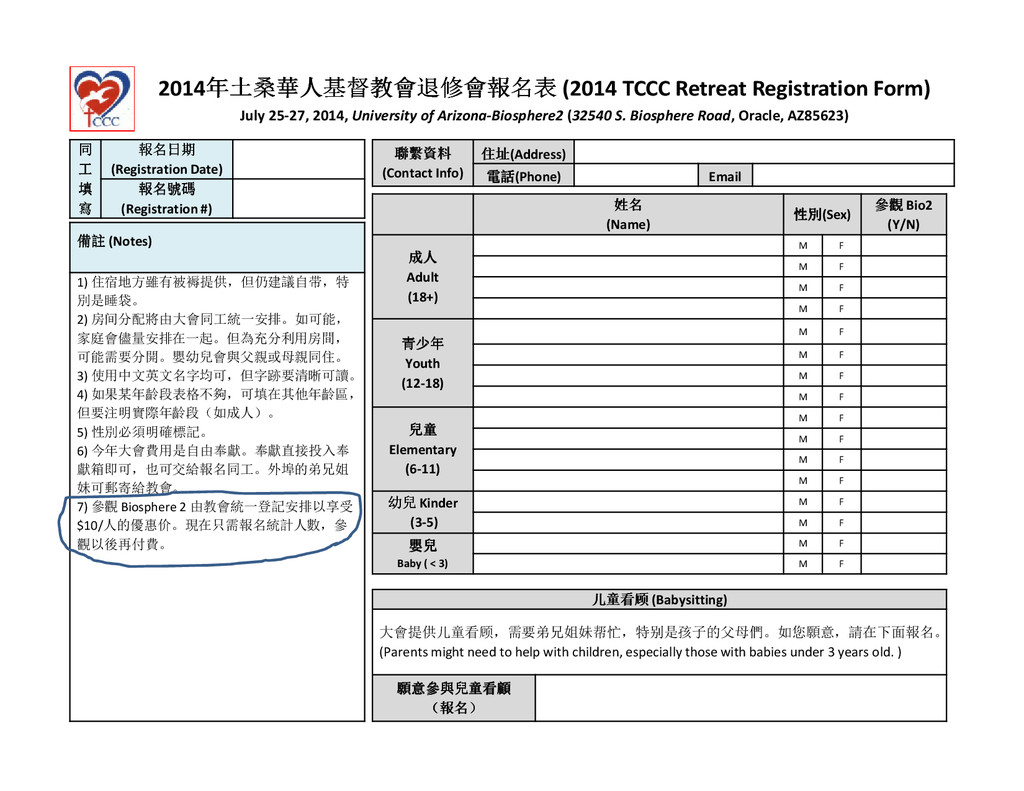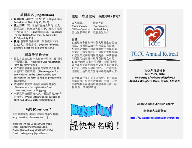 4 月 20 日至 7 月 13 日 (Registration Period: April 20 to July 13, 2013) 截止日期 截止日期 截止日期 截止日期 : 預計場地可容納人數為 120 人, 報滿為止。但無論人數多少,报名手续须 于 7 月 13 日下午 11:59 时前完成。 (Deadline: the registration form must be turn in by 11:59pm July 13.) 費用 費用 費用 費用 : 憑感動自由奉獻。聚會成本大約 $140/ 人,僅供參考。 (Freewill offering. Estimated cost will be $140/person.) 注意事項 注意事項 注意事項 注意事項 (Notes) 報名方式請以每一家庭為一單位,使用同 一張報名表。 (Please use ONE registration form per family unit.) 請在報名表中相應位置為您的兒女報名, 以便同工安排活動。 (Please register for your children at the corresponding age positions in the form to help us prepare the programs.) 請將報名表交給呂炳庚或項則賢弟兄。 (Please return the registration form to coworkers, Jason or Binggeng . ) 奉獻支票抬頭請寫 TCCC ,備註請寫 2014 年 退修會。 (Make Offering check payable to TCCC and Memo: 2014 TCCC Retreat.) 疑問 疑問 疑問 疑問 (Questions)? 如有疑問請与呂炳庚或項則賢弟兄聯絡。 (Any question, please contact : ) Binggeng (Mike) Lu at 520-248-0858 Email: