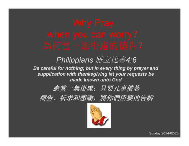 careful for nothing; but in every thing by prayer and supplication with thanksgiving let your requests be made known unto God. 應當一無掛慮;只要凡事借著 禱告、祈求和感謝,將你們所要的告訴 神。 Sunday 2014-02-23