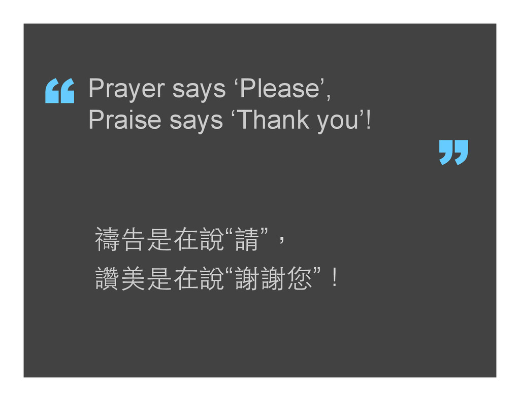 Prayer says ‘Please’, Praise says ‘Thank you’! “ ” 禱告是在說“請”,