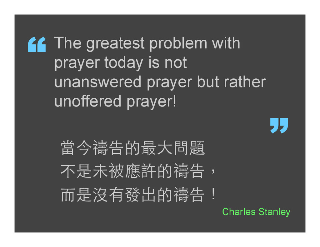but rather unoffered prayer! “ ” Charles Stanley 當今禱告的最⼤大問題 不是未被應許的禱告, ⽽而是沒有發出的禱告!