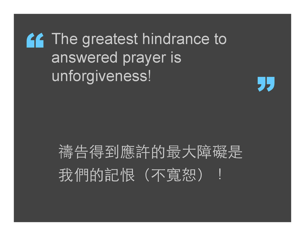 禱告得到應許的最⼤大障礙是 我們的記恨(不寬恕)!