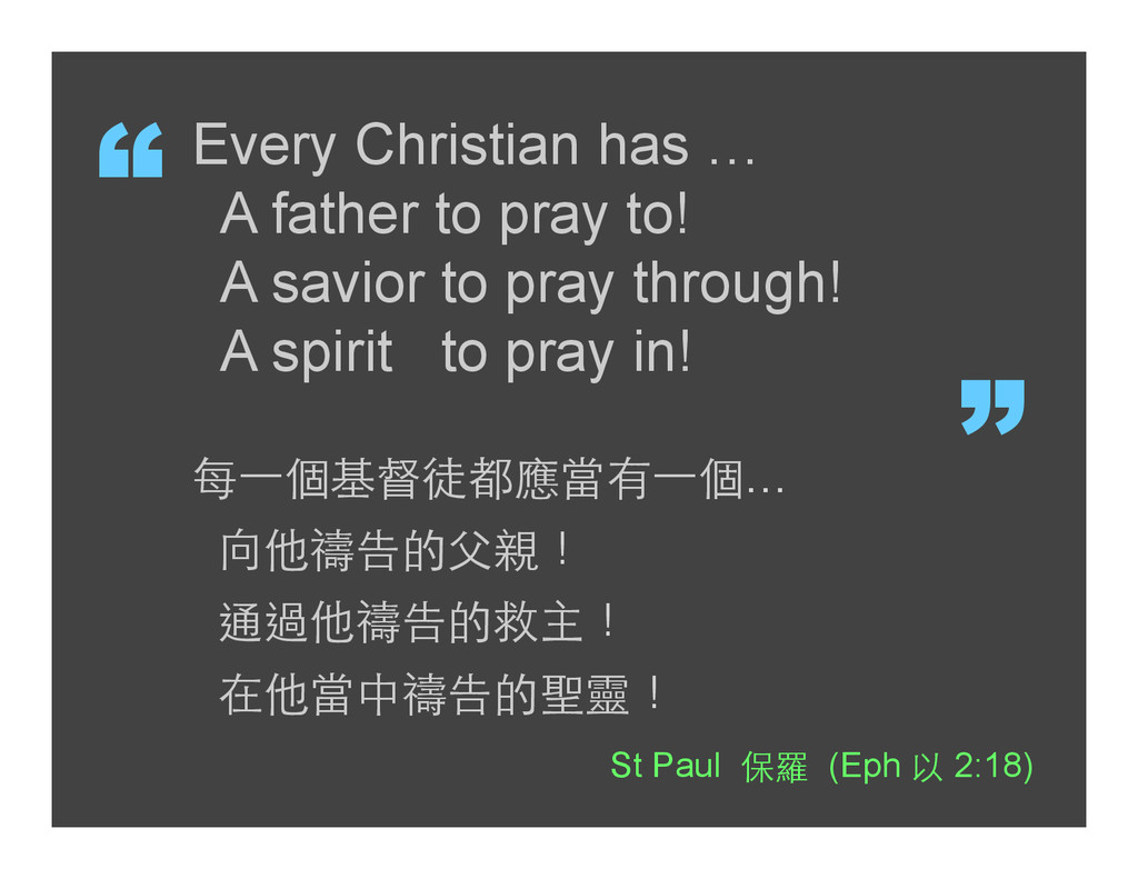 savior to pray through! A spirit to pray in! “ ” St Paul 保羅 (Eph 以 2:18) 每⼀一個基督徒都應當有⼀一個… 向他禱告的⽗父親! 通過他禱告的救主! 在他當中禱告的聖靈!