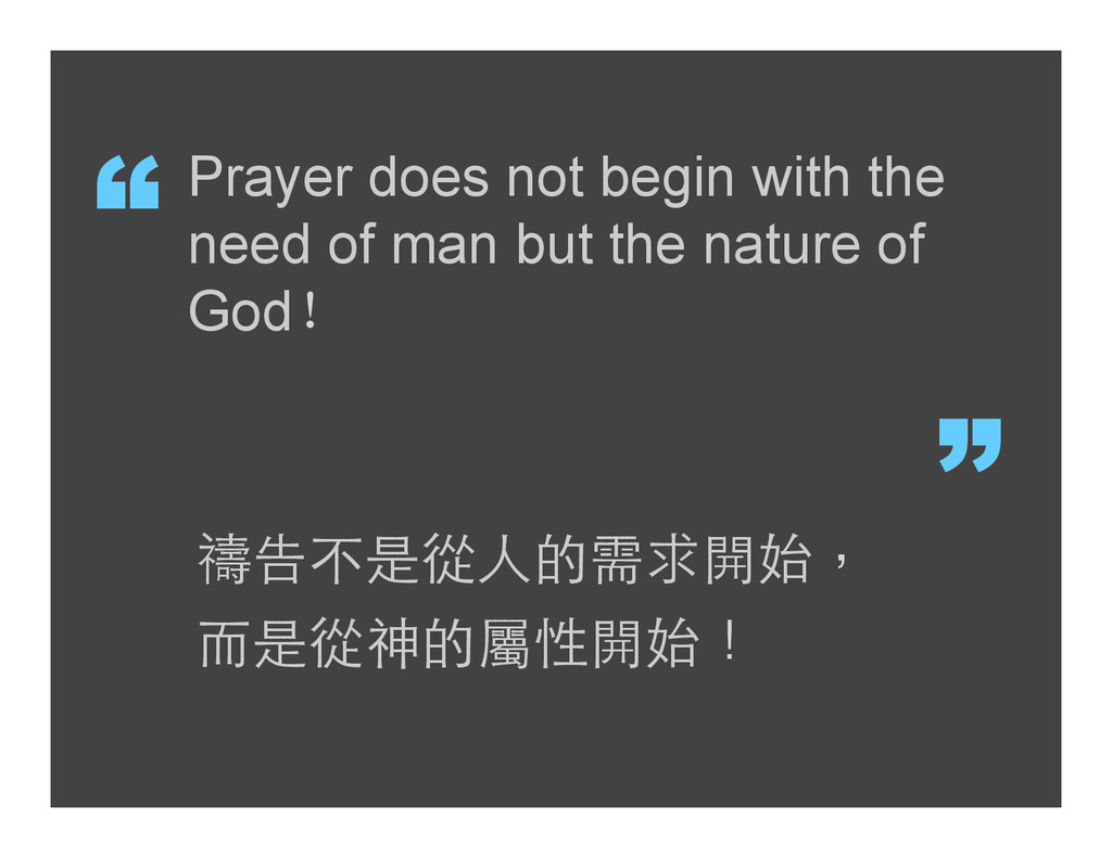 the nature of God! “ ” 禱告不是從⼈人的需求開始, ⽽而是從神的屬性開始!