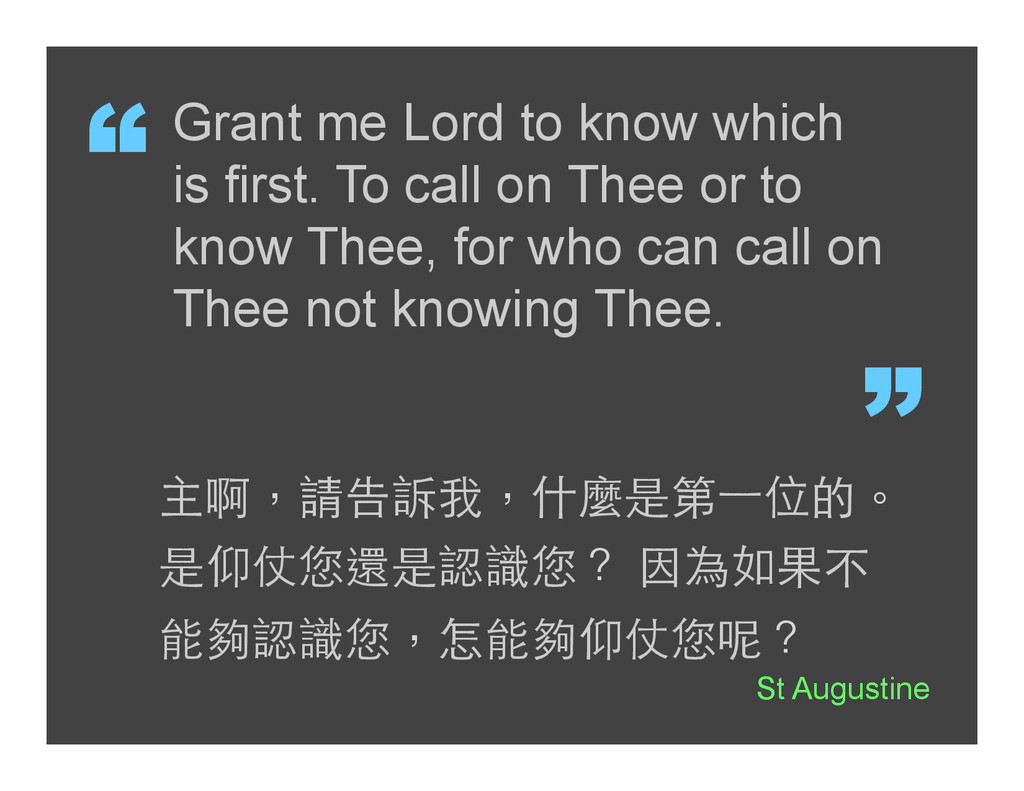 on Thee or to know Thee, for who can call on Thee not knowing Thee. “ ” St Augustine 主啊,請告訴我,什麼是第⼀一位的。 是仰仗您還是認識您? 因為如果不 能夠認識您,怎能夠仰仗您呢?