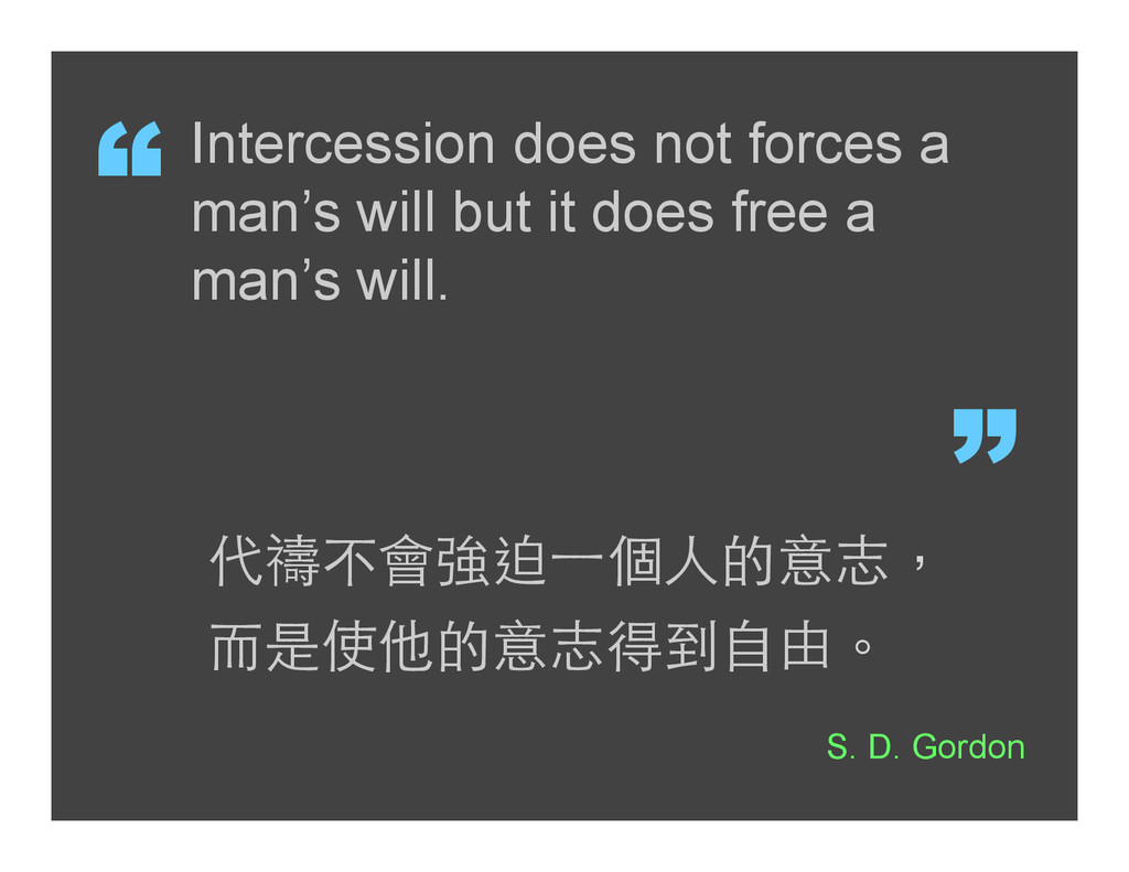 free a man’s will. “ ” S. D. Gordon 代禱不會強迫⼀一個⼈人的意志, ⽽而是使他的意志得到⾃自由。