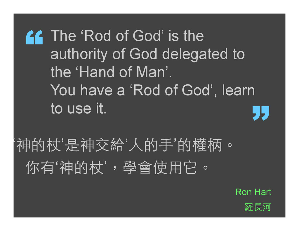 to the ‘Hand of Man’. You have a ‘Rod of God’, learn to use it. “ ” Ron Hart 羅⻑⾧長河 ‘神的杖’是神交給‘⼈人的⼿手’的權柄。 你有‘神的杖’,學會使⽤用它。
