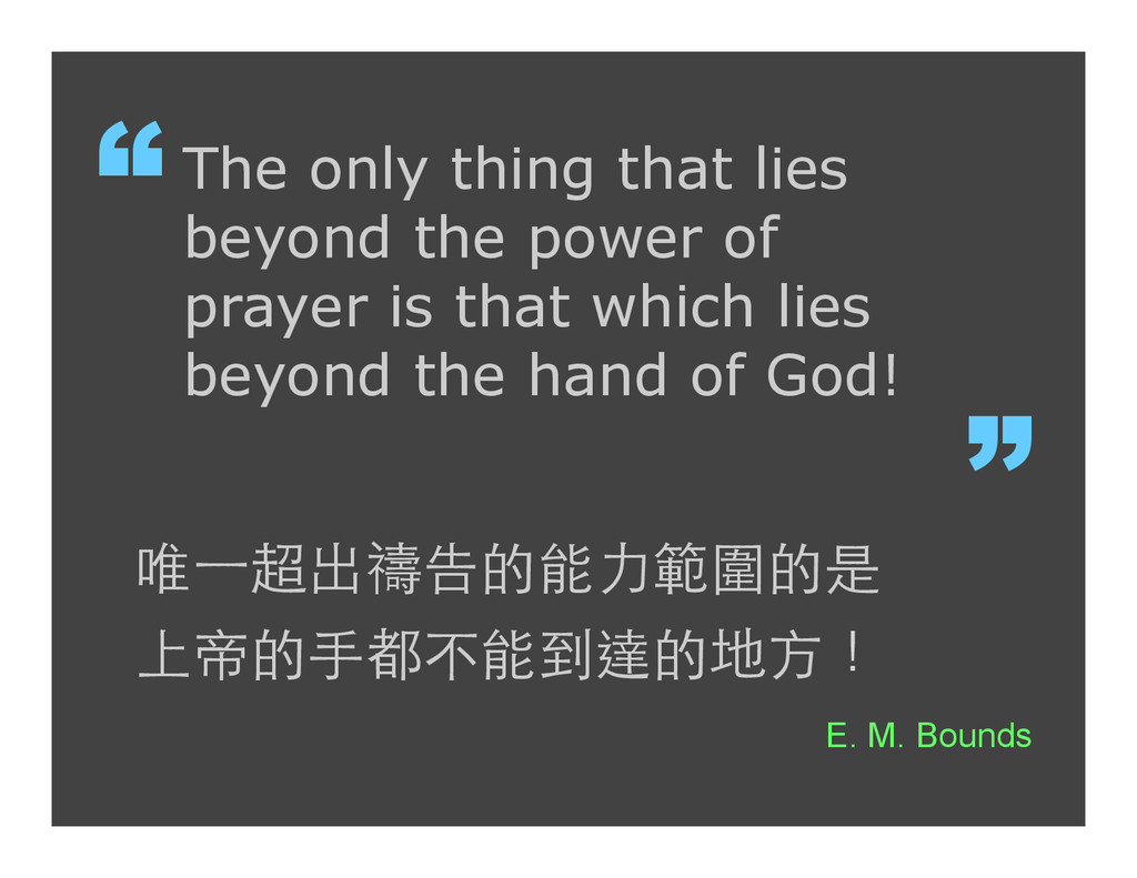 is that which lies beyond the hand of God! “ ” E. M. Bounds 唯⼀一超出禱告的能⼒力範圍的是 上帝的⼿手都不能到達的地⽅方!