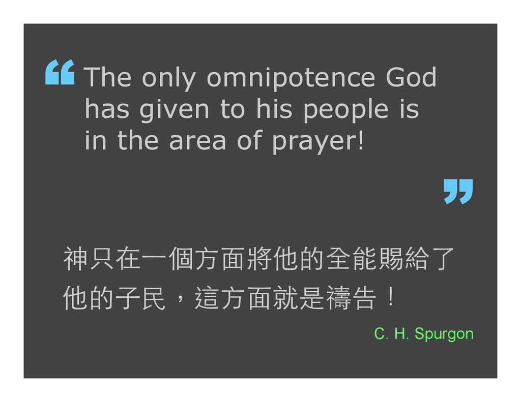 in the area of prayer! “ ” C. H. Spurgon 神只在⼀一個⽅方⾯面將他的全能賜給了 他的⼦子⺠民,這⽅方⾯面就是禱告!