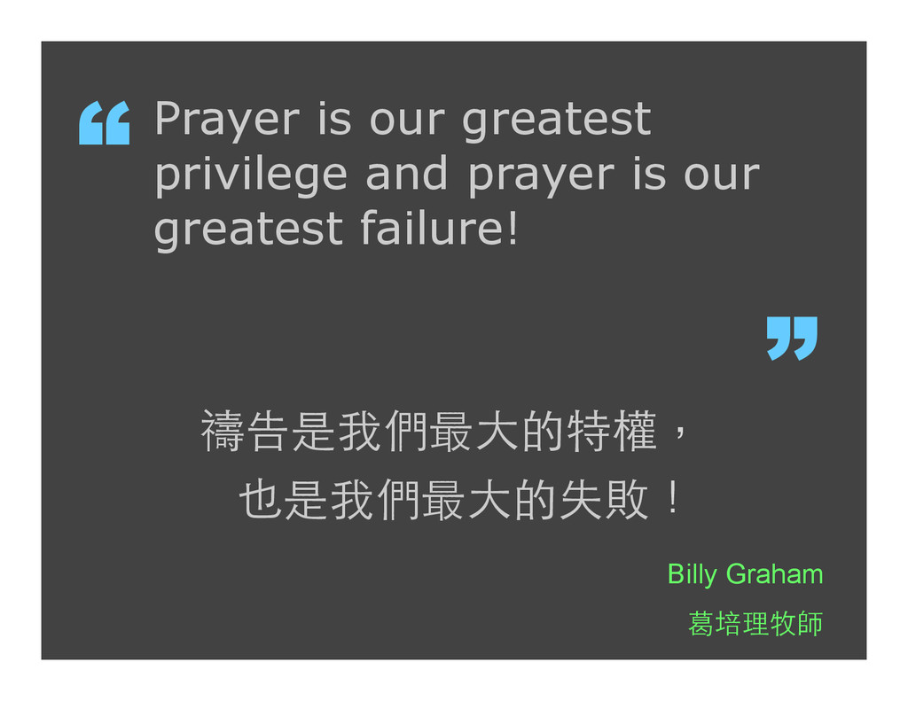 failure! “ ” Billy Graham 葛培理牧師 禱告是我們最⼤大的特權, 也是我們最⼤大的失敗!