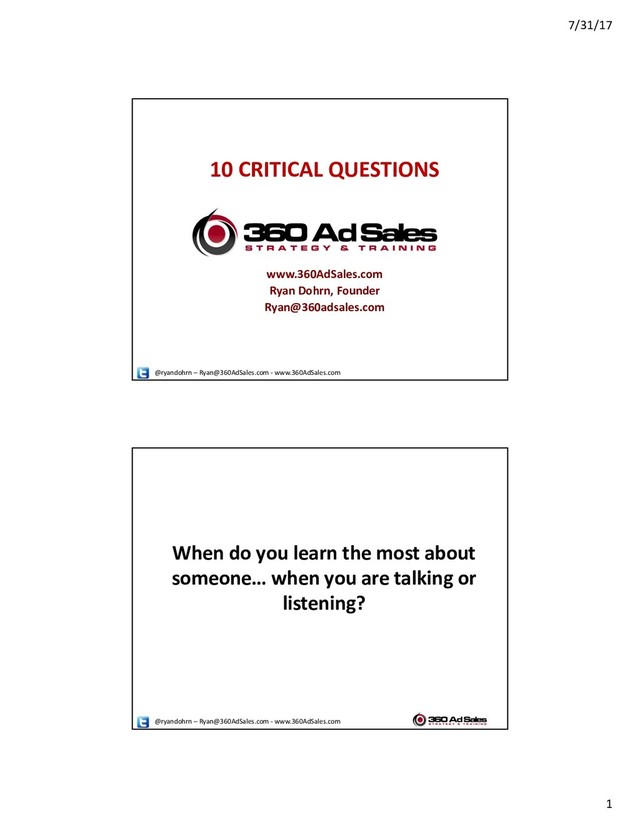 @ryandohrn – [email protected] - www.360AdSales.com When do you learn the most about someone… when you are talking or listening? @ryandohrn – [email protected] - www.360AdSales.com