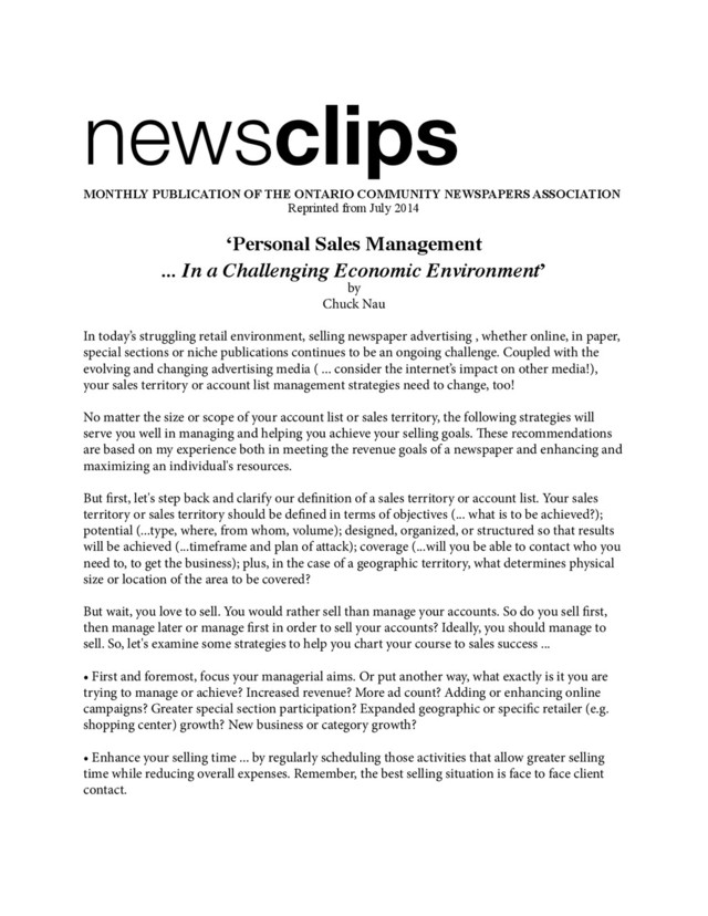 or sales territory and prioritize each account potential both on a short term (30 - 60 - 90 day) and long term (6 -12 -18 month) basis, and on a more revenue (+), flat revenue (0), or less revenue (-) growth basis. Don't overlook those accounts that are at risk (due to credit limitations, personnel changes, competitive changes or market impacts). Note them and give them the 'kid glove treatment' to save or maintain the business. What additions do you plan to make to your account list or sales territory, in terms of NEW business? Grow your online revenue from BOTH new and existing accounts? Much like retailing, if you remain stagnant, 15% to 25% of your business will go away in a year. ! • Practice time management. Fine tune again and again. Stop procrastinating and wasting time. Know yourself and understand the value of time, using your most productive time during the day to be with your clients! Don’t allow your email to become a major distraction. Tell your clients and discipline yourself to check-in with your email only at selected times throughout the day. ! • Say NO! Don't allow time to be thoughtlessly given away by you. Good customer service does NOT mean never saying no. ! • Organize your information. How? By developing a pitch book. A pitch book ideally is a three ring binder and/or its electronic equivalent that contains information on your market, your newspaper, your competition plus any data you need to tell and sell your newspaper's story. Make sure your information is accessible and presentable ... and current. ! • Delegate and use all available resources ... Everyone at your newspaper is part of your sales and marketing team, from top to bottom and bottom to top. Remember, no one can do it all. Keep all your newspaper resources in the selling loop, enhance and use them! ! • Insure your personal and professional growth. Don't overlook or abuse your physical, emotional, mental, and spiritual needs. Take time for you. Maintain a positive attitude, don't dwell on past failures or rejections - use them to build on future successes. Network and build professional friendships in your market and adjacent communities. Develop peer relationships with other salespeople and newspapers throughout the state. Reward yourself by taking care of yourself - Have FUN!!!!! Keep fine tuning. Learn from others. Look for those opportunities to excel. Keep changing and challenging yourself to take the time to plan and manage so you will achieve selling success. ! ... and remember, something good is going to happen today, look for it! ! © Murray & Nau, Inc. ! Chuck Nau of Murray & Nau, Inc. is a Seattle area based publishing consultant and sales and management trainer. He has conducted advertising, marketing, management and sales training workshops throughout North America. Comments and questions are welcome and may be directed to Chuck via email:
