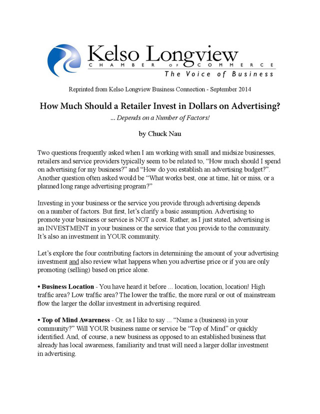 are? Have you reviewed your competitive advantages ... what benefits set you off from others in your community? What’s unique about your business or service? Businesses in a market with a number of competitors will need a larger dollar investment in advertising as opposed to a one of a kind business in a market. ! • Price vs Value - It’s ALL About Value! What’s the value of your business or service? Teach your staff ( and remind yourself) NOT to give “facts”. Rather talk BENEFITS or how the facts or features you offer will help solve a need or problem (or opportunity) your customer has. Facts create objections ... BENEFITS reinforce your value and sell your goods or services. ! A business that only guarantees lowest price or features ongoing sales must continually reinforce this message and therefore will require a larger dollar investment in advertising. When you advertise price, or if you are only selling price ... you have to continue to lower the price, or come up with enhanced incentives, on an ongoing basis in order to continue building your customer base. Value! It’s All about value ... your business or service value! ! Now that you have clarified some of the factors to consider as you move forward with your advertising investment planning ... the next question is how to establish an advertising budget. ! Most retailers set their investment in advertising dollars based on a percentage of sales. In other words, if your monthly sales goal is $10,000 to maintain a positive cash flow and GROW your business, most retailers would consider a $300 (3% of monthly sales goal) to $500 (5% of monthly sales goal) monthly ad budget BEFORE taking the aforementioned contributing factors into consideration. ! In closing, do not allow your advertising investment to be wasted. One time or “hit and miss” advertising has a very high likelihood of generating minimal, if any results. ! Planning an advertising campaign (a series of ads, with a set aside/allocated budget, within a timeframe, to meet an IDENTIFIED need, problem or opportunity, with a DESIRED outcome) will maximize your advertising investment dollars. ! Next month, I will outline and clarify some simple methods to track and monitor your advertising or promotion to answer that question ... “How Do You Know?” ... if your advertising or promotion is effective and achieving your strategic goals? © Murray & Nau, Inc.