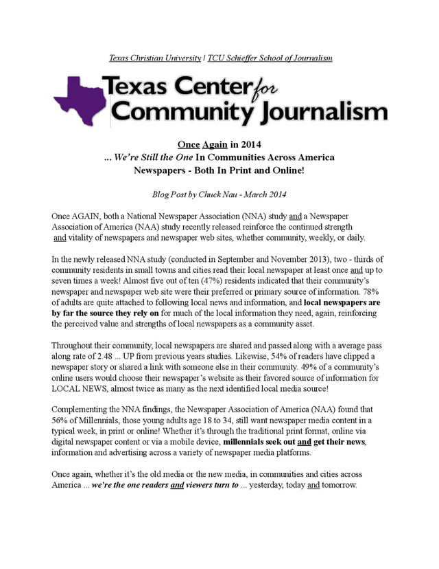 web site are the ‘value collection’... a content combination of local news and advertising, interacting with the community in a timely and up to date manner, with a unique, trusted and well established brand that delivers simple, identifiable and measurable response and results day after day or week after week. ! Why? Simply put, newspapers, whether in print or online, have a distinct local audience that trusts them. ! Loyalty is print's strongest selling point. Your neighbors, friends, business associates and you seek it out, it draws you in and talks to you about things in your life, in a specific and intimate fashion. This is a choice your neighbors, friends, business associates and you make to spend dedicated, uninterrupted time focused on your newspaper and/or your newspaper web site ! It is all about the quality of the audience. Our newspaper web site visitors are loyal and interactive returning to their newspaper web site several times per day. Newspaper web site visitors continue spending more and more time on your newspaper web site rather than as eyeballs darting around the Internet! Our newspaper web site visitors also read their newspaper ... reinforcing our advertisers’ message and increasing awareness of local news and advertisers. ! Newspapers’ web sites, much like their print products, deliver original, high-quality content that continually attracts a highly educated audience, again, building a powerful and engaged audience. As we have noted in the past, year after year, study after study, the facts are in ... ! Advertisers know that newspaper advertising, both in print and online, works to motivate consumers to take action and that newspapers are the one that local community ‘influentials’ and ‘shoppers’ turn to! Who typically has the largest Internet media footprint in a community and in the local marketplace? You do!! Your local newspaper web site! ! Newspapers, your newspaper, online and in print, best represent your community. ! Through a local environment of news and advertising, your newspaper and your newspaper web site create the marketplace for your community. ! Newspapers ... We’re Still the One! Does EVERYONE at your newspaper know? Do your friends, community associates, advertisers and potential advertisers know? ! Don’t let newspapers, your newspaper and its web site be the best kept secret in your community ... We’re Still the One! © Murray & Nau, Inc. Comments and questions are welcome and may be directed to Chuck via email: