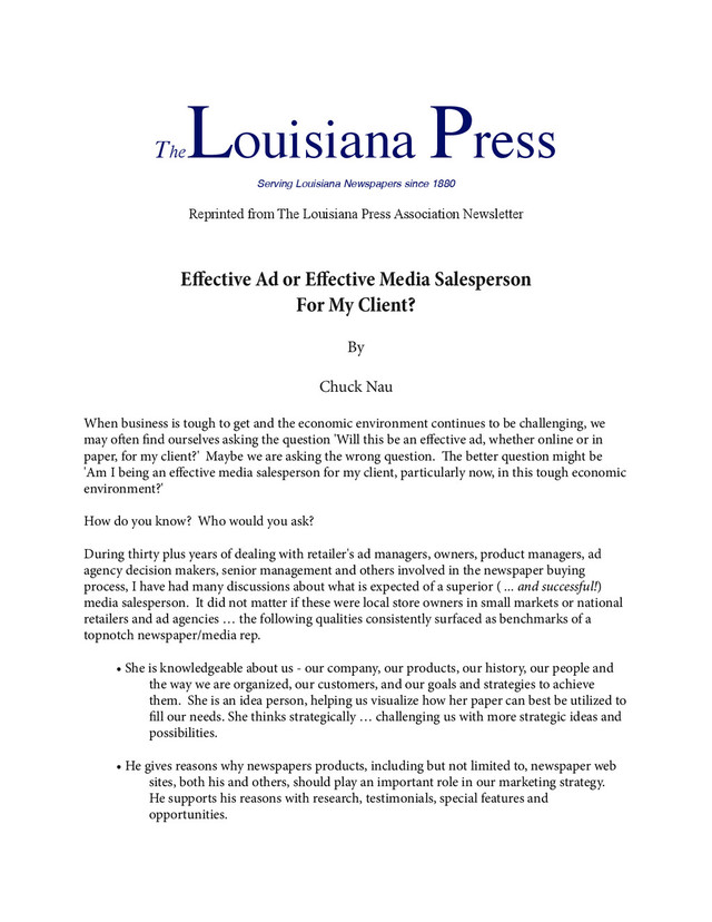 in understanding the value of his newspaper's readership and overall audience (print and online). He continually feeds us promotional material, updated market information and new product rollouts ( social and mobile media possibilities) thereby positively reinforcing our involvement with and investment in many of his newspaper products. ! • She is an account manager, not a salesperson. She is our point person for all of our contacts or dealings with her newspaper. She's enthusiastic and likes what she is doing, she's honest, and acts in her company's behalf when she should and our interests when she should. She anticipates problems that may occur and works to minimize their impact on our working relationship. ! • He is prepared whenever he works with us, understanding the value of time, using ours and his efficiently and effectively. He is familiar with our budgets, calendars, sale events and the overall decision making process. He is always thinking in terms of a plan or strategy, has an objective in mind, and rarely, if ever, discusses just one ad. ! • She sells from top to bottom, including everyone involved in the planning and decision making process. She helps solve our marketing challenges and problems, overcoming obstacles, and building on our successes. She keeps our entire team aware of any changes (at the paper, with the paper, in the market, outside the market) and regularly reviews with us her overall newspaper story. ! Last but not least, a topnotch media salesperson doesn't sell. Rather, he rolls up his sleeves and works to understand what his client is trying to accomplish. Helping them realize their goal and strategies through creative problem solving develops a long term partnership between his newspaper and the client’s organization that benefits them both. ! © Murray & Nau, Inc. ------------------------------------------------------------------------------------------------------------ ! Chuck Nau of Murray & Nau, Inc. is a Seattle area based publishing consultant and sales and management trainer. He has been a speaker for and conducted advertising, marketing, management and sales training workshops with newspapers, niche publishers, publishing groups and press associations, throughout North America. ! Comments and questions are welcome and may be directed to Chuck via email: