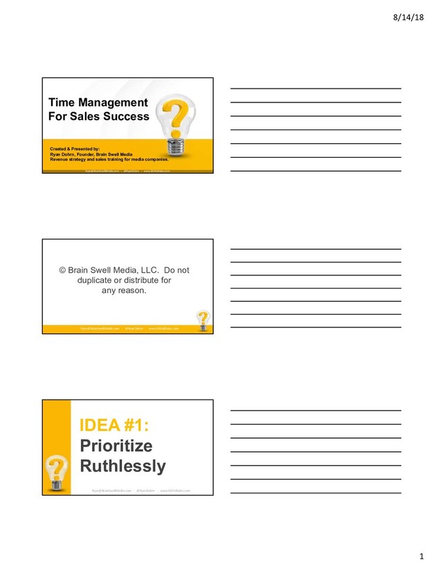 your manager in advance and TOGETHER set your time management goals. 2. People abusing your time is often about THEM not understanding your time management efforts. [email protected] - @RyanDohrn - www.360AdSales.com 1. Prioritize Ruthlessly 2. Avoid Random Patterns 3. Create Time Blocks 4. Create templates 5. Turn off email pop up/chime. 6. Schedule time for research 7. Become a CRM expert 8. Create a process for everything 9. Set time limits for everything 10. Manage Up & Around you [email protected] - @RyanDohrn - www.360AdSales.com
