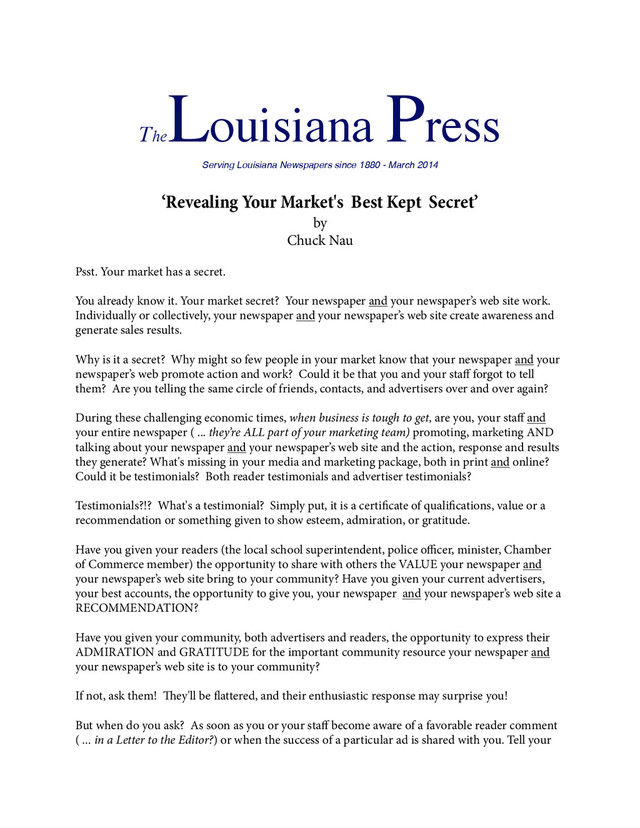 your paper, your newspaper’s web site and the community (...because they are!). Tell them that you do not want their thoughts to be lost or forgotten. ! Assist your readers or advertisers in crafting a well written and complimentary (to both of you) testimonial. Typically, it may be a brief three or four sentences on their letterhead or over their signatures. Present them with a framed final version to display in their place of business or office, overlaid on a image of your masthead or front page. Ask your publisher for a hand written note of thanks to slip into the outside of the frame. Deliver your framed testimonial in person with other members of your staff or key executives. ! Once you have your testimonial in hand, market it and promote it to the utmost. First and foremost, design an appealing and professional format for your testimonials. Typically, this has been a newspaper ad featuring selected quotes from the testimonial plus a photo of the individuals providing the quote. If appropriate, a photo of their place of business can also be used. ! However, something is missing in the typical in-paper testimonial ad. Have you ever seen a testimonial ad for an automobile that does not feature the actual automobile product? ! Is your newspaper or your newspaper’s web site, the product the testimonial is all about, featured? But don't just drop it in the testimonial - put it in the hands of the individual giving the testimonial. Help those seeing your testimonial envision how your newspaper or your newspaper’s web site played a key role in the growth and success of this local community business. Help those seeing your testimonial envision how your product, your newspaper and your newspaper’s web site, play an important role in this reader's life in your community. ! But let's go for back for a moment. A testimonial for your paper in your paper? A testimonial for your paper’s web site on your newspaper’s web site? Are we preaching to the choir? That's not all bad, but it may be limiting your exposure. ! Make your testimonials a key ingredient in your marketing or media package. Select some of your best testimonials and add them to your rate card, special section calendar, reader profile, and market information. As you collect a variety of testimonials, reproduce them with a photo and abbreviated quotes and compile a series of them (reader and advertiser) on an 8 1/2 x 11 sheet and include it in all your marketing and promotional efforts. ! As you frame your testimonials and present them to your advertisers and readers for their places of business, office or home, do the same for your newspaper. Display your newspaper and newspaper web site’s testimonials through out your newspaper. Share them with your visitors and with your vendors. Familiarize your newspaper coworkers with your testimonials. Hang them in a variety of places within your newspaper’s facilities. Month after month rotate them, adding new ones and retiring others. Last but not least, keep your testimonials alive, current, and visible. Each and every day remind those around you that your newspaper and its web site are awareness generating, results producing resources in your community! ! © Murray & Nau, Inc.