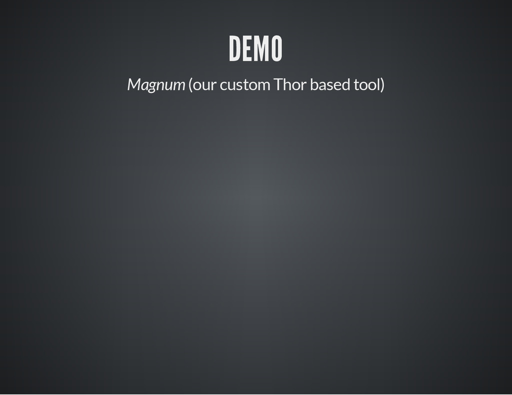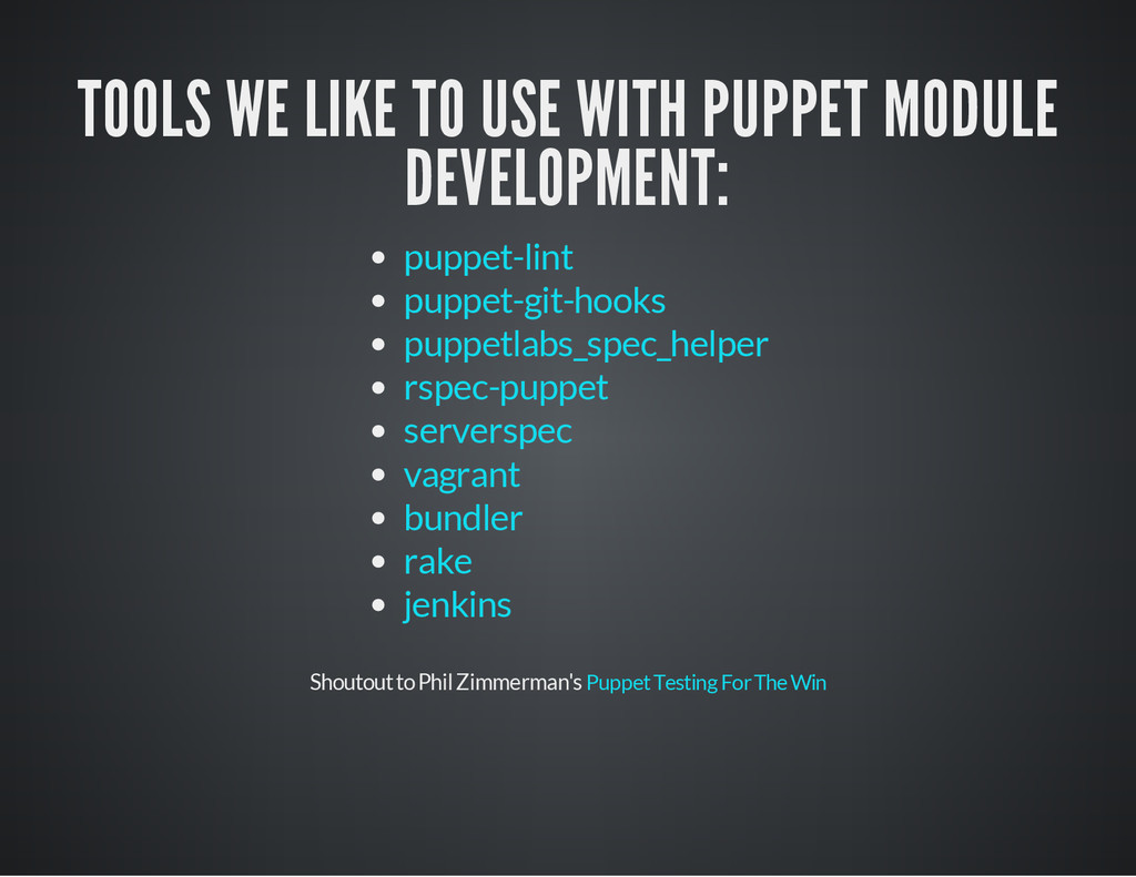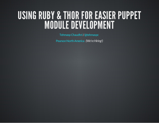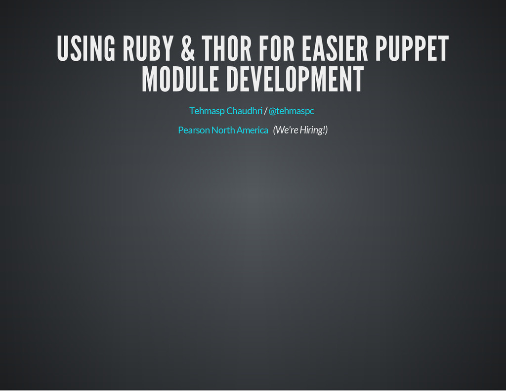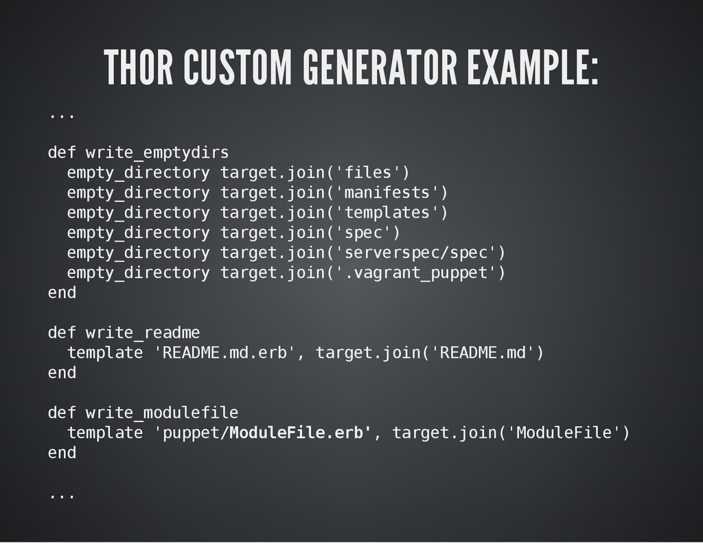 in Ruby, our Puppet code is in a Ruby DSL. Thor's custom project generator use case was appealing and works well. It's easy to add and update template files. We wanted to create a framework for Puppet module development which provided the Puppet tools we like, so that we could create standalone & well tested Puppet modules. Thor let us glue all this together. Business Reasons: We allow (many) dev teams to contribute to our Puppet module development; thus we needed a way to make creating Puppet modules quick & easy, consistent, manageable, and with 'best practices' baked in.