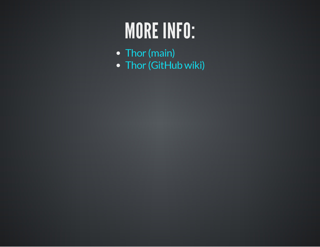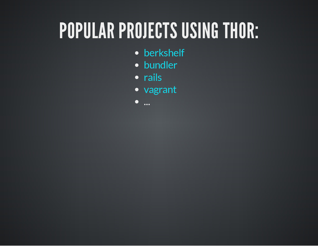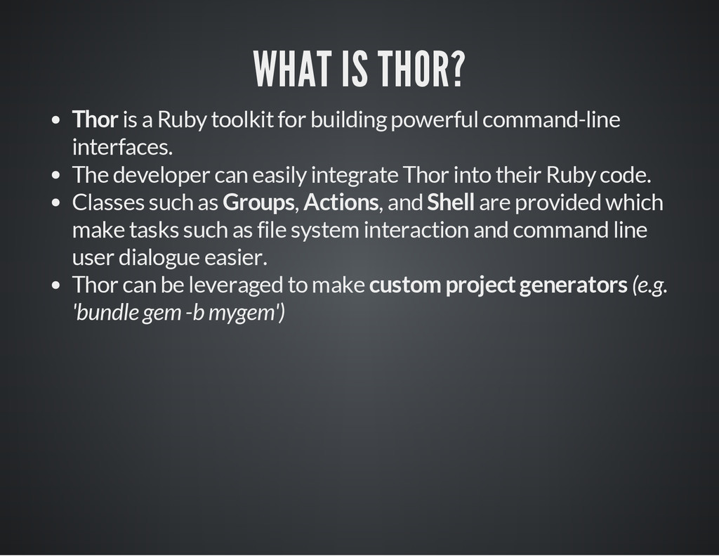 powerful command-line interfaces. The developer can easily integrate Thor into their Ruby code. Classes such as Groups, Actions, and Shell are provided which make tasks such as file system interaction and command line user dialogue easier. Thor can be leveraged to make custom project generators (e.g. 'bundle gem -b mygem')