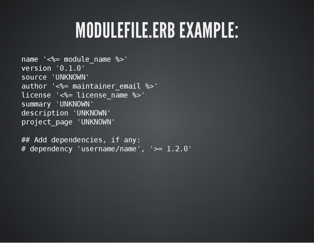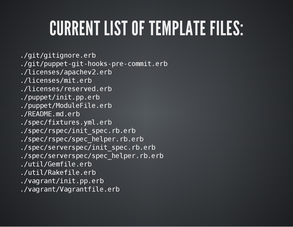 w r i t e _ e m p t y d i r s e m p t y _ d i r e c t o r y t a r g e t . j o i n ( ' f i l e s ' ) e m p t y _ d i r e c t o r y t a r g e t . j o i n ( ' m a n i f e s t s ' ) e m p t y _ d i r e c t o r y t a r g e t . j o i n ( ' t e m p l a t e s ' ) e m p t y _ d i r e c t o r y t a r g e t . j o i n ( ' s p e c ' ) e m p t y _ d i r e c t o r y t a r g e t . j o i n ( ' s e r v e r s p e c / s p e c ' ) e m p t y _ d i r e c t o r y t a r g e t . j o i n ( ' . v a g r a n t _ p u p p e t ' ) e n d d e f w r i t e _ r e a d m e t e m p l a t e ' R E A D M E . m d . e r b ' , t a r g e t . j o i n ( ' R E A D M E . m d ' ) e n d d e f w r i t e _ m o d u l e f i l e t e m p l a t e ' p u p p e t / M o d u l e F i l e . e r b ' , t a r g e t . j o i n ( ' M o d u l e F i l e ' ) e n d . . .