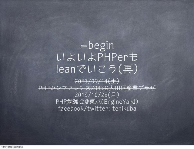 =begin いよいよPHPerも leanでいこう(再) 2013/09/14(土) PHPカンファレンス2013@大田区産業プラザ 2013/10/28(月) PHP勉強会@東京(EngineYard) facebook/twitter: tchikuba 1310݄31༵