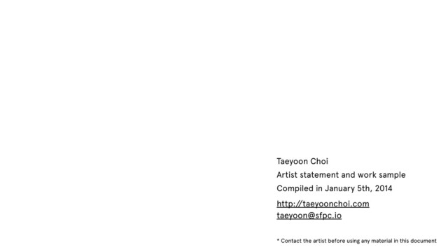 USA 2010~current Dorkbot, Location One, New York, USA 2012 ARTALK, Culture Hub, New York, USA 2012 NAND to XOR, City College of New York, New York, USA, 2012 Art of Tourism, The Creators Project, Seoul, South Korea 2011 Digital Day Camp, Eyebeam Art and Technology Center, New York, USA 2011 Interactivos? Medialab Prado, Madrid, Spain 2010 Drawing +-, Parsons New School for Design, New York, USA 2009 OFLAB, Ars Electronica, Linz, Austria 2008 Interactivos? Eyebeam Art and Technology Center, New York, USA 2008 Urban Programming 101, Upgrade! International, Skopje, Macedonia 2008 Publication Invisible Cities, Moleskine Special edition, 2012 Roadshow South Korea, New Normal Business, Total Museum of Art, 2012 Anti-Manifesto, New Normal Business, New York 2012 Urban programming 101: Stage direction, Mediabus, Seoul, 2011 Press: Dazed and Confused, London, United Kingdom 2013 Kaleidoscope, Spring 2012 Architizer.com 2012 Dazed and Confused, Seoul, South Korea 2011 Younger than Jesus, New Museum, New York USA 2009 CNET, 2011 Kontrol; Issue#1 “The pornography of fabricating fear”. Nomad.tv 2006 Container Culture. Leornardo, Volume 39, Issue 4 - August 2006. MIT Press