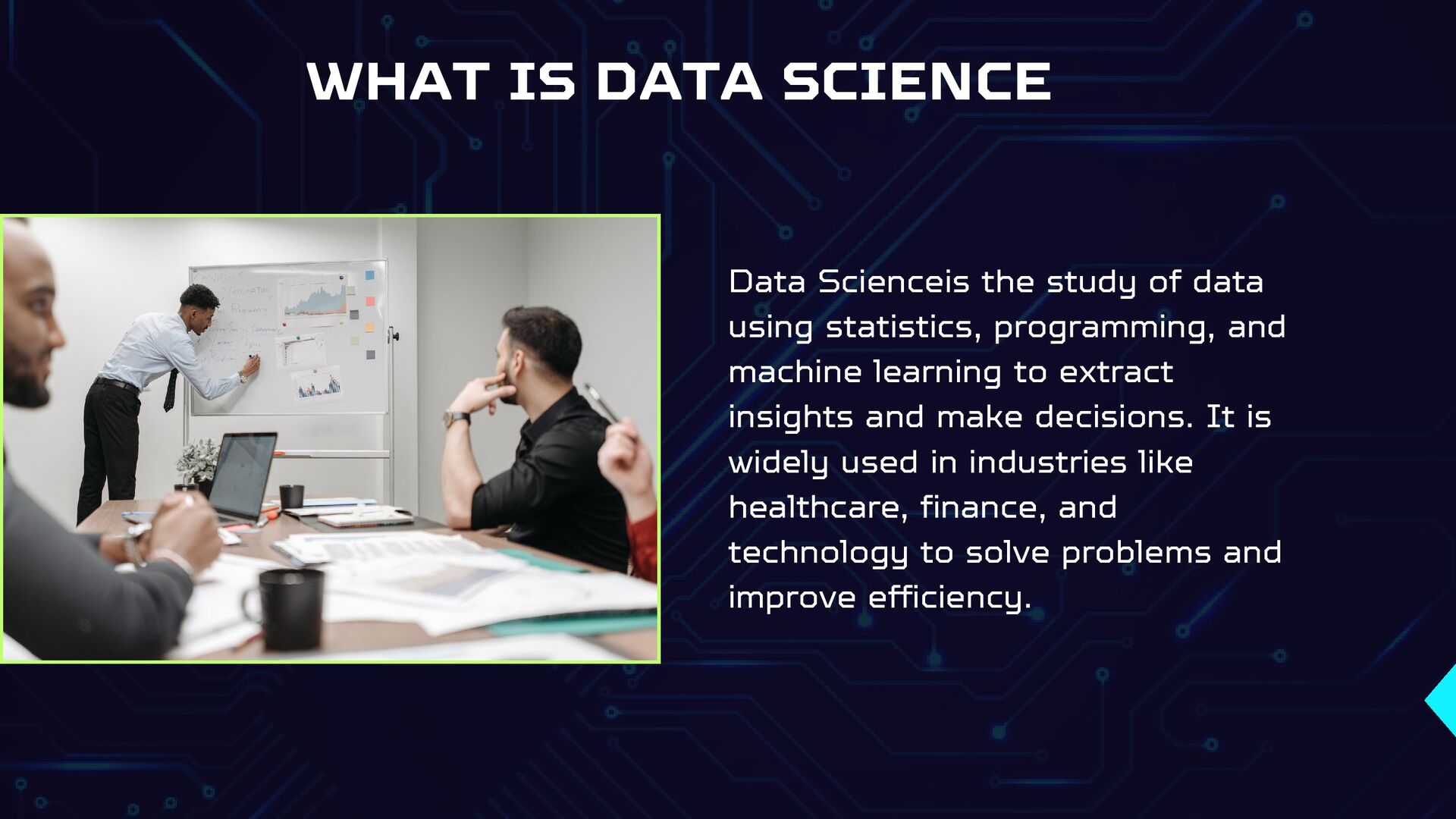 using statistics, programming, and machine learning to extract insights and make decisions. It is widely used in industries like healthcare, finance, and technology to solve problems and improve efficiency.
