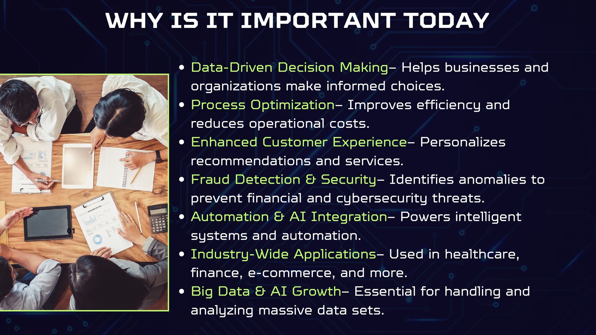 choices. Process Optimization– Improves efficiency and reduces operational costs. Enhanced Customer Experience– Personalizes recommendations and services. Fraud Detection & Security– Identifies anomalies to prevent financial and cybersecurity threats. Automation & AI Integration– Powers intelligent systems and automation. Industry-Wide Applications– Used in healthcare, finance, e-commerce, and more. Big Data & AI Growth– Essential for handling and analyzing massive data sets. WHY IS IT IMPORTANT TODAY