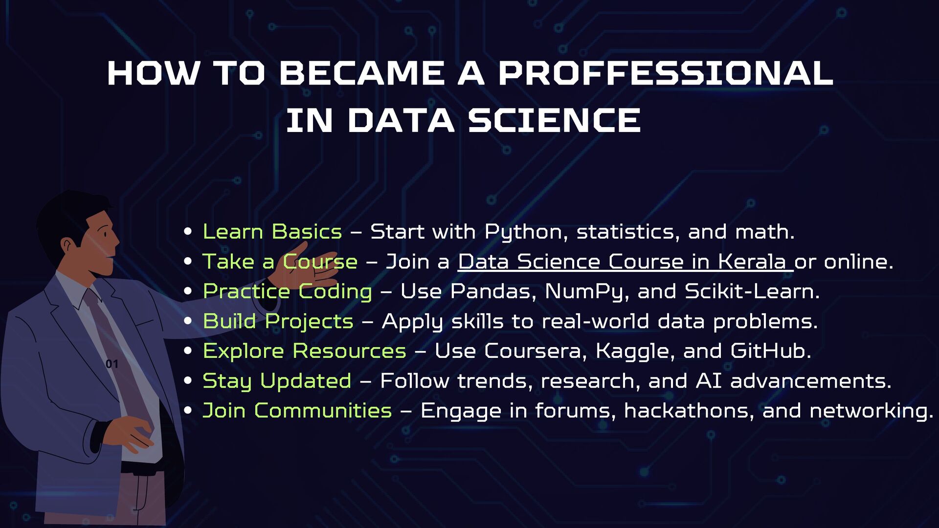 Basics – Start with Python, statistics, and math. Take a Course – Join a Data Science Course in Kerala or online. Practice Coding – Use Pandas, NumPy, and Scikit-Learn. Build Projects – Apply skills to real-world data problems. Explore Resources – Use Coursera, Kaggle, and GitHub. Stay Updated – Follow trends, research, and AI advancements. Join Communities – Engage in forums, hackathons, and networking.