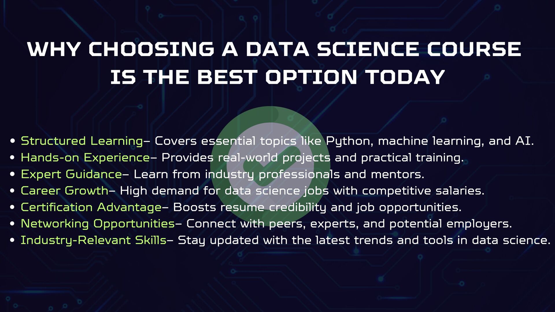 OPTION TODAY Structured Learning– Covers essential topics like Python, machine learning, and AI. Hands-on Experience– Provides real-world projects and practical training. Expert Guidance– Learn from industry professionals and mentors. Career Growth– High demand for data science jobs with competitive salaries. Certification Advantage– Boosts resume credibility and job opportunities. Networking Opportunities– Connect with peers, experts, and potential employers. Industry-Relevant Skills– Stay updated with the latest trends and tools in data science.