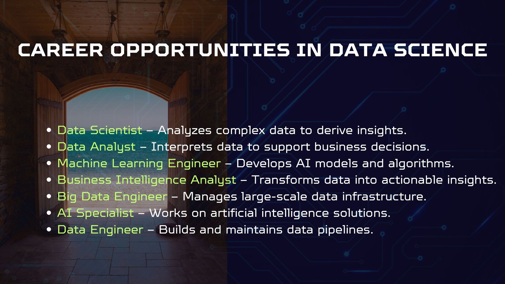 Data Analyst – Interprets data to support business decisions. Machine Learning Engineer – Develops AI models and algorithms. Business Intelligence Analyst – Transforms data into actionable insights. Big Data Engineer – Manages large-scale data infrastructure. AI Specialist – Works on artificial intelligence solutions. Data Engineer – Builds and maintains data pipelines. CAREER OPPORTUNITIES IN DATA SCIENCE